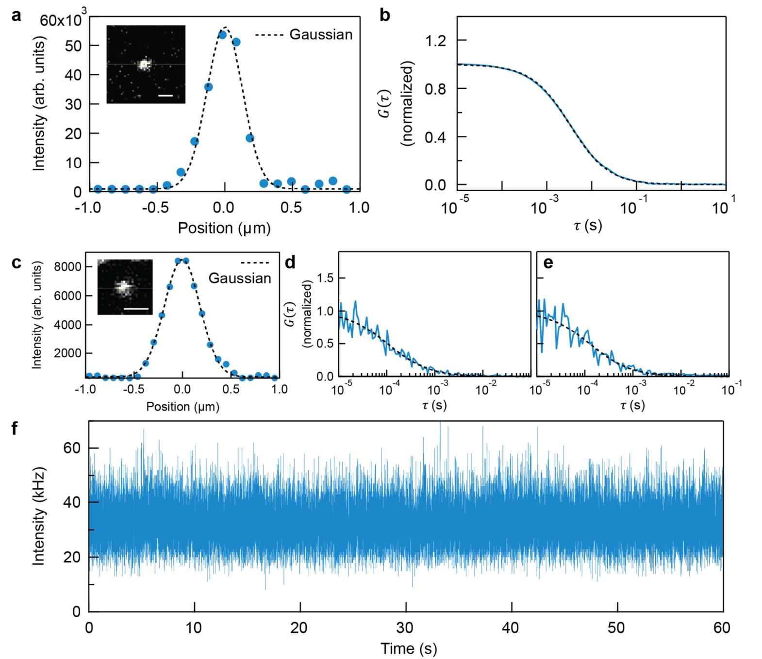 \begin{document}$$\delta I\left(t\right)=I\left(t\right)-\left\langle I\left(t\right)\right\rangle$$\end{document}δIt=It−It, where I(t) is the fluorescence intensity and the brackets denote time averages. The autocorrelation curve was fitted by an anomalous diffusion model (dashed line). In this example, the number of particles was 42, and the average intensity (shown in e) was 32 kHz, corresponding to a molecular brightness of 0.76 kHz/molecule. Source data are provided as a Source Data file.