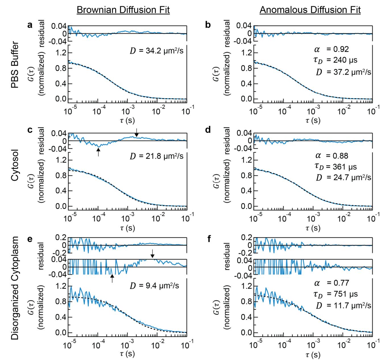 Supplementary Figure 3: Diffusion analysis of FCS autocorrelation functions. a, c, e, Fitting a Brownian model to data for BSA diffusion in PBS buffers, cytosolic extracts, and disordered cytoplasmic extracts. b, d, f, Fitting an anomalous diffusion model to the same data. Note that Brownian motion ideally yields 𝛼 = 1 even with anomalous diffusion fits (also see Supplementary Fig. 2b)