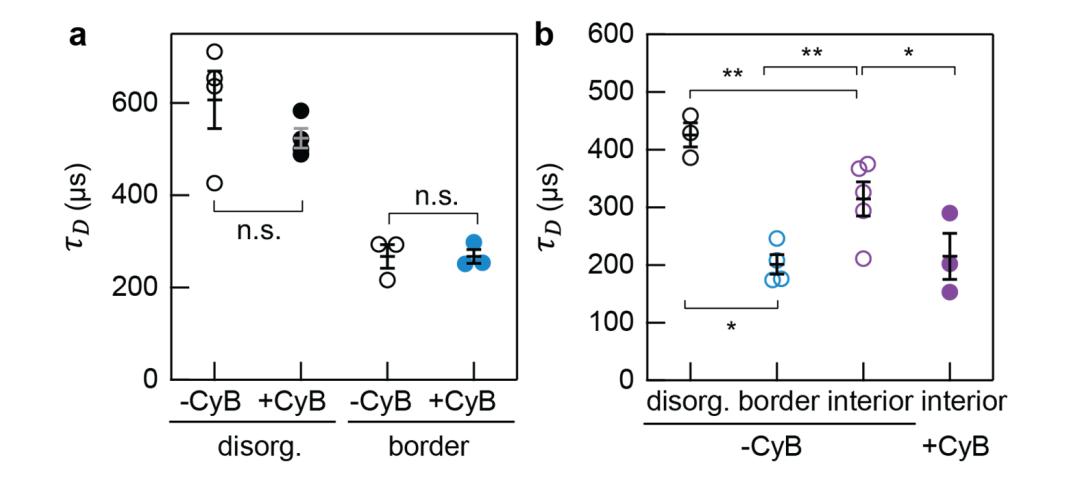 Figure 5. a, b Normalized diffusion times of BSA in actin-intact extracts, prepared without the addition of cytochalasin B (CyB). Note that the diffusion rate did not increase more during the self-organization of actin-intact extracts (open circles) than it did in actin-inhibited extracts (solid circles). The two panels are two independent experiments. c, d Degree of subdiffusion in actin-intact and actin-inhibited extracts. Data shown in panel c and d are from the same experiment shown in panel a and b, respectively. Error bars, SEM. n = {3, 3, 4, 5, 6; 3, 3, 3, 4, 5, 6, 3} measurements of different positions in an extract for data from left to right and top to bottom, respectively. Source data are provided as a Source Data file.