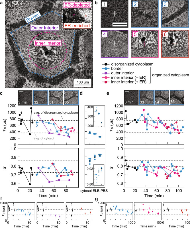 Fig. 2. Dynamical transition of short-range diffusion in cytoplasmic extracts.a, Spatial regions of self-organization (color-coded), classified by the ER morphology. The dark sphere near the center of the inner interior is the nuclei. The image was stitched from multiple confocal images. b Representative confocal images of FCS foci, which are marked by the crosshairs. The annotated numbers refer to snapshots taken prior to FCS measurements in c. c Tracing protein diffusion during self-organization by FCS. The plots show the characteristic diffusion times τD and the diffusion mode α obtained from fitting the FCS curves. Black and gray dashed lines correspond to averages from disordered cytoplasmic extracts (in this example, 740 µs, Deff = 11.9 µm2/s) and cytosolic extracts (360 µs, Deff = 24.7 µm2/s), respectively. d Benchmark measurements from cytosolic extracts and buffers. ELB, egg lysis buffer; PBS, Phosphate-buffered saline. Insets show zoom-in of the data. Each condition was measured five times; all data presented by error bars are mean ± SEM. n = 5 measurements of different positions in a sample. e, Biological repeat of c, prepared from a separate batch of eggs. f, g are isolated traces from c and e. Error bars, estimated errors (standard deviation) from curve fitting (each fitting was performed over n = 107 data points). Scale bars, 100 µm. Source data are provided as a Source Data file.