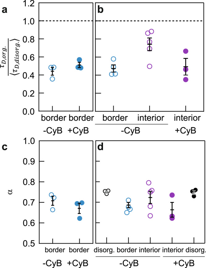 Fig. 5. Protein diffusion in actin-intact extracts.a, b Normalized diffusion times of BSA in actin-intact extracts, prepared without the addition of cytochalasin B (CyB). Note that the diffusion rate did not increase more during the self-organization of actin-intact extracts (open circles) than it did in actin-inhibited extracts (solid circles). The two panels are two independent experiments. c, d Degree of subdiffusion in actin-intact and actin-inhibited extracts. Data shown in panel c and d are from the same experiment shown in panel a and b, respectively. Error bars, SEM. n = {3, 3, 4, 5, 6; 3, 3, 3, 4, 5, 6, 3} measurements of different positions in an extract for data from left to right and top to bottom, respectively. Source data are provided as a Source Data file.