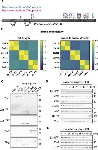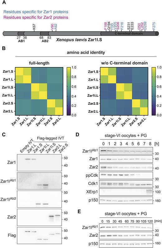 Figure 1. Zar1l is a novel member of the Zar protein family expressed during Xenopus meiotic maturation. (A) Schematic representation of Zar1l.S from Xenopus laevis. The conserved C-terminal domain and the two antigens used to raise antibodies 1 (AB1) and 2 (AB2) are indicated in dark gray. According to Yamamoto et al. (2013), the numbered amino acids are characteristic for distinguishing between Zar1 and Zar2 from amphibians to mammals. Blue and magenta indicate identical residues between Zar1l and Zar1, and Zar1l and Zar2, respectively. Zar1l residues that cannot be assigned to either Zar1 or Zar2 are in black. (B) Heat map showing amino acid identity between the L- and S-versions of the Xenopus laevis Zar family proteins. Left, between full-length proteins; right, without the conserved C-terminal RNA-binding domain (amino acid Gln179-Ile281 of Zar1l.S). (C) In vitro translated (IVT) Flag-tagged L- and S-versions of the Zar family proteins in Xenopus laevis were immunoblotted with the indicated antibodies. Empty IVT reaction not expressing a Zar protein served as a control. (D,E) Stage VI oocytes were treated with PG. Samples were taken at the indicated time points and immunoblotted with the indicated antibodies. One representative experiment of three biological replicates is shown.