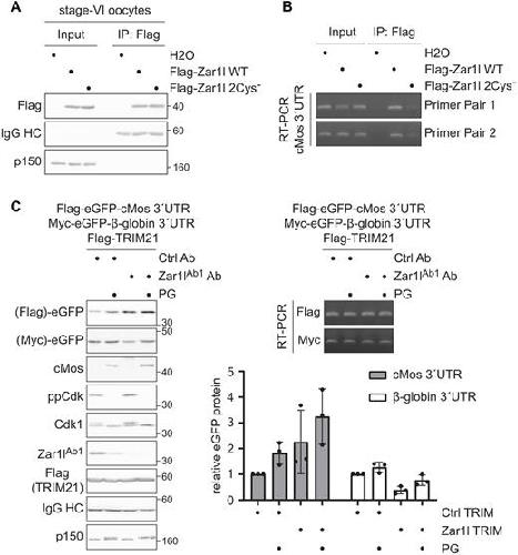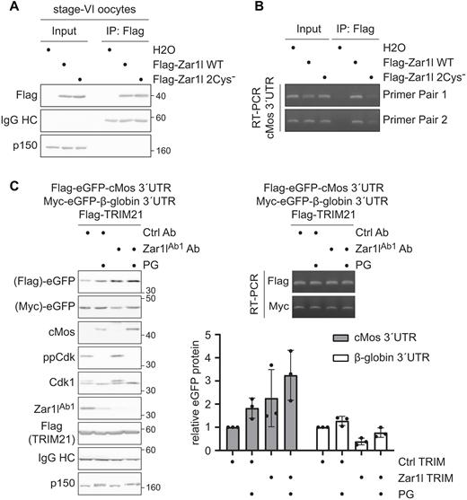 Figure 3. Zar1l binds the cMos mRNA and deregulates its translation. (A) Stage VI oocytes were injected with mRNA encoding Flag-Zar1l.S that was either wild type (WT) or mutated to alanine at Cys190 and Cys217 (2Cys−). After 18 h incubation, oocyte lysates were subjected to anti-Flag immunoprecipitation (IP) and samples were immunoblotted as indicated. (B) RNA was isolated from samples in A and reverse transcribed to cDNA. RT-PCR with two primer pairs specific for the cMos.L 3′UTR was performed to semi-quantitatively determine cMos mRNA levels in each sample. One representative experiment of three biological replicates is shown. (C) Stage VI oocytes were co-injected with Zar1lAb1 or control (Ctrl) antibodies, with mRNA encoding Flag-TRIM21 and with mRNA encoding the Flag-eGFP-cMos 3′UTR and Myc-eGFP-β-globin 3′UTR constructs. After 42 h, oocytes were treated with PG or left untreated. Oocytes from all conditions were lysed when 50% of PG-treated oocytes injected with Ctrl antibodies underwent GVBD. Samples were immunoblotted with the indicated antibodies. In parallel, RNA was isolated from the same samples and reverse transcribed, and RT-PCR against the reporter mRNAs was performed. Immunoblots and RT-PCR results of one experiment and quantification of the eGFP signal from three independent biological replicates are shown. Values were normalized to untreated oocytes injected with Ctrl antibodies and are given as mean±s.d.