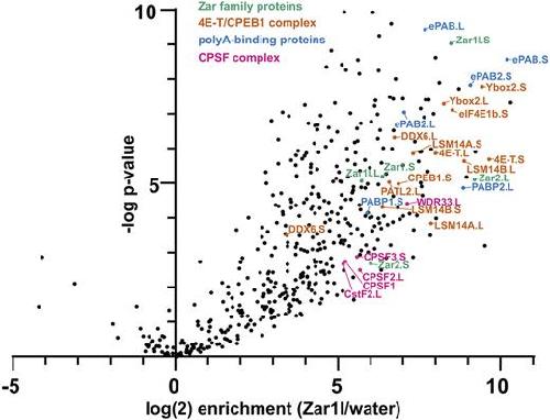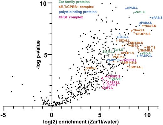 Figure 4. Identification of Zar1l-binding partners in Xenopus oocytes by mass spectrometry. (A) Stage VI oocytes were injected with mRNA encoding Flag-Zar1l.S or water as control. After 18 h incubation, oocytes were lysed and subjected to anti-Flag immunoprecipitation. The lysates were not RNase-treated. Proteins were eluted from the beads and analyzed by MS. Graph shows relative enrichment [log(2) enrichment] in the Zar1l condition over the water control plotted against the corresponding P value [−log(10) P value as determined by an unpaired Student's t-test] of three independent biological replicates. Selected significantly enriched (s0=0.1, FDR≤0.01) proteins are indicated.