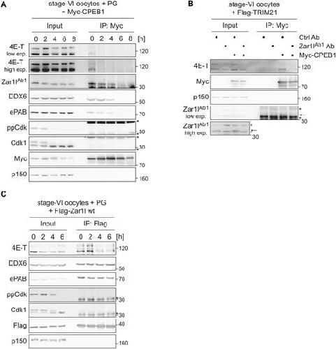 Zar1l affects the association between CPEB1 and 4E-T. (A) Stage VI oocytes were injected with mRNA encoding Myc-CPEB1.S. After 18 h, oocytes were treated with PG and lysed at the indicated time points. Oocyte lysates were subjected to anti-Myc immunoprecipitation and samples were immunoblotted as indicated. Low and high exposure immunoblots are shown for 4E-T. Asterisks indicate unspecific bands. One representative experiment of three biological replicates is shown. (B) Stage VI oocytes were co-injected with Zar1lAb1 or unspecific control (Ctrl) antibodies, mRNA encoding Flag-TRIM21 and mRNA encoding Myc-CPEB1.S. After 42 h, oocyte lysates were subjected to anti-Myc immunoprecipitation and samples were immunoblotted as indicated. Low and high exposure immunoblots are shown for Zar1l. Arrows indicate Zar1l. Asterisks indicate unspecific bands. One representative experiment of three biological replicates is shown. (C) Stage VI oocytes were injected with mRNA encoding Flag-Zar1l.S. After 18 h incubation, oocytes were treated with PG and lysed at the indicated time points. Oocyte lysates were subjected to anti-Flag immunoprecipitation and samples were immunoblotted with the indicated antibodies. Asterisks indicate unspecific bands. One representative experiment of three biological replicates is shown.