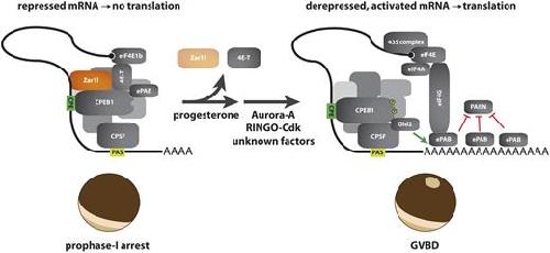 Figure 7. Working model for the function of Zar1l during meiosis in Xenopus laevis. Control of the mRNA translation status by Zar1l during prophase I arrest (left) and after meiotic resumption (right) in oocytes of Xenopus laevis.