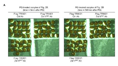 Fig. S2. Depletion of Zar1l accelerates meiotic resumption. A) Representative stereomicroscope images of movie used to quantify meiotic timing of oocytes in Fig. 2B. Images were taken t=0 min and t=240 min after PG addition.