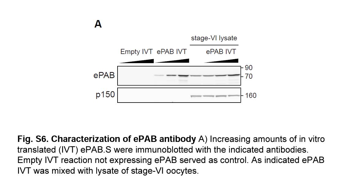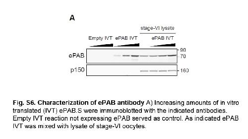Fig. S6. Characterization of ePAB antibody A) Increasing amounts of in vitro translated (IVT) ePAB.S were immunoblotted with the indicated antibodies. Empty IVT reaction not expressing ePAB served as control. As indicated ePAB IVT was mixed with lysate of stage-VI oocytes.