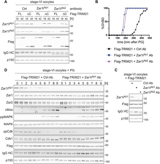 Figure 2. Depletion of Zar1l accelerates meiotic resumption. (A) Stage VI oocytes were co-injected with the indicated Zar1l or unspecific control (Ctrl) antibodies and with mRNA encoding Flag-tagged full-length (FL) TRIM21 or truncated (ΔC) TRIM21 deficient in antibody binding. Samples were taken at the indicated time points and immunoblotted as indicated. One representative experiment of two biological replicates is shown. (B,C) Stage VI oocytes were co-injected with the indicated Zar1l or unspecific control (Ctrl) antibodies and mRNA encoding Flag-TRIM21. Samples were taken 42 h after injection and immunoblotted with the antibodies indicated in C. In parallel, oocytes (Ctrl, n=20; Zar1lAb1, n=21; Zar1lAb2, n=16) were treated with PG and time until GVBD was determined by the appearance of a white spot in the animal hemisphere of the oocyte in B (representative images shown in Fig. S2A). One representative experiment of three biological replicates is shown. (D) Stage VI oocytes were co-injected with Zar1lAb1 or unspecific control (Ctrl) antibodies and mRNA encoding Flag-TRIM21. 42 h after injection, oocytes were treated with PG, samples were taken at the indicated time points and immunoblotted as indicated. One representative experiment of three biological replicates is shown.