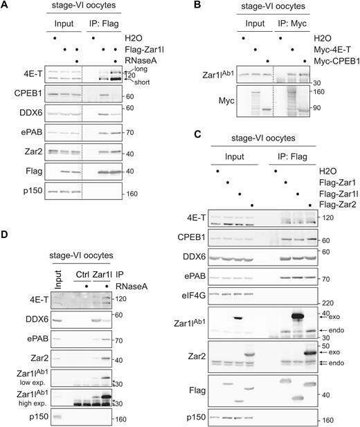 Figure 5. Zar1l is part of a repressive RNP containing 4E-T. (A) Stage VI oocytes were injected with water or mRNA encoding Flag-Zar1l.S. After 18 h incubation, oocytes were lysed and treated with RNaseA as indicated. Oocyte lysates were subjected to anti-Flag immunoprecipitation and samples were immunoblotted as indicated. Long and short isoforms of 4E-T are indicated. Several lanes were removed at the dashed line. One representative experiment of three biological replicates is shown. (B) Stage VI oocytes were injected with water or mRNA encoding Myc-tagged 4E-T.L or CPEB1.S. After 18 h incubation, oocyte lysates were subjected to α-Myc immunoprecipitation and samples were immunoblotted with the indicated antibodies. Several lanes were removed at the dashed line. One representative experiment of three biological replicates is shown. (C) Stage VI oocytes were injected with water or mRNA encoding Flag-tagged Zar1.S, Zar1l.S or Zar2.S. After 18 h incubation, oocyte lysates were subjected to anti-Flag immunoprecipitation and samples were immunoblotted with the indicated antibodies. Arrows indicate endogenous and exogenous Zar1l and Zar2 proteins. One representative experiment of three biological replicates is shown. (D) Stage VI oocytes were lysed and treated with RNaseA as indicated. Oocyte lysates were subjected to immunoprecipitation with Zar1lAb1 or unspecific control (Ctrl) antibodies and samples were immunoblotted with the indicated antibodies. Low and high exposure immunoblots are shown for Zar1l. Asterisks indicate unspecific bands. One representative experiment of three biological replicates is shown.