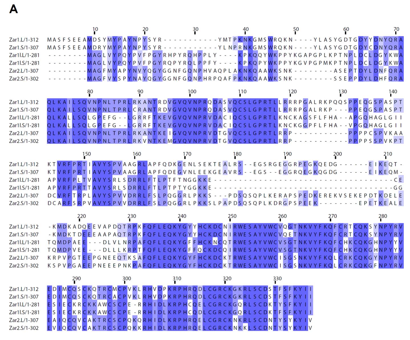 Fig. S1. Alignment of Xenopus laevis Zar family proteins. A) Alignment of full-length L- and S-versions of the Xenopus laevis Zar family proteins. Coloring indicates amino acid similarity.