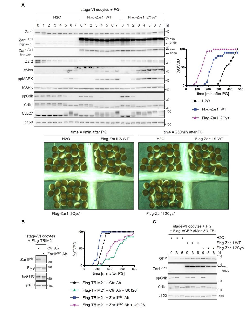 Fig. S3. A) Stage-VI oocytes were injected with water or mRNA encoding Flag-Zar1l.S that was either wild-type (WT) or mutated to alanine at Cys190 and Cys217 (2Cys-). After 42 h incubation, oocytes were treated with PG and samples were taken at the indicated time points for immunoblotting. Arrows highlight endogenous and exogenous Zar1l proteins. In parallel, oocytes (water: n=22, WT: n=21, 2Cys-: n=22) were imaged and time until GVBD was determined by the appearance of a white spot in the animal hemisphere of the oocyte. Representative stereomicroscope images of movie used to quantify meiotic timing of oocytes is shown. Images were taken t=0 min and t=230 min after PG addition. One representative experiment of three independent biological replicates is shown. B) Stage-VI oocytes were co-injected with Zar1lAb1 or unspecific control (Ctrl) antibodies and mRNA encoding Flag-TRIM21. Samples were taken 42 h after injection and immunoblotted with the indicated antibodies. In parallel, oocytes (Ctrl: n=20, Ctrl+U0126: n=21, Zar1lAb1: n=20, Zar1lAb1+U0126: n=20) were treated with PG and U0126 as indicated and time until GVBD was determined by the appearance of a white spot in the animal hemisphere of the oocyte. One representative experiment of three biological replicates is shown. C) Stage-VI oocytes were co-injected with water or mRNA encoding Flag-Zar1l.S that was either wild-type (WT) or mutated to alanine at Cys190 and Cys217 (2Cys-) and mRNA with the coding sequence for Flag-eGFP followed by the complete 3´UTR of the cMos.L mRNA. After 42 h, oocytes were treated with PG and samples were taken at the indicated time points for immunoblotting. Arrows highlight endogenous and exogenous Zar1l proteins. One representative experiment of three biological replicates is shown.