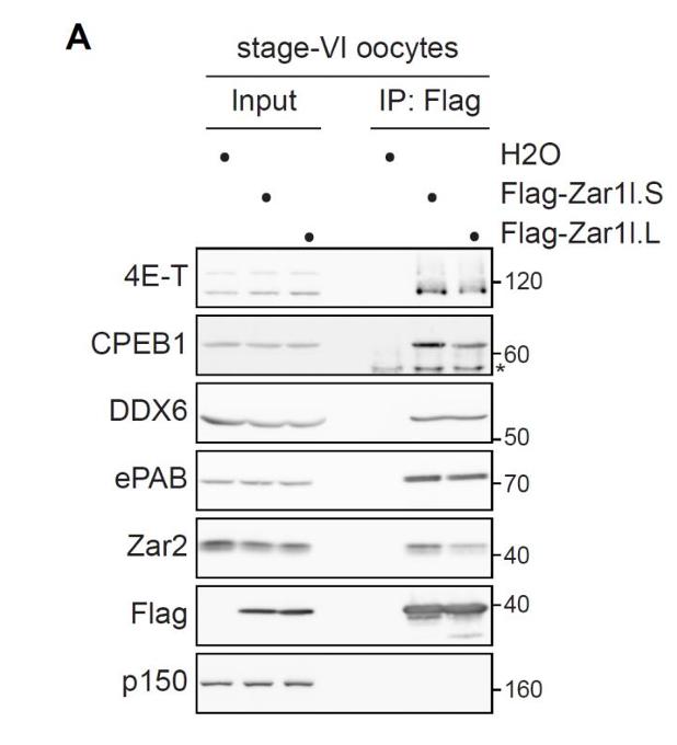 Fig. S4. Characterization of Zar1l.S and Zar1l.L interaction partners A) Stage-VI oocytes were injected with water or mRNA encoding Flag-tagged Zar1l.S or Zar1l.L. After 18 h incubation, oocyte lysates were subjected to α-Flag IP and samples were immunoblotted with the indicated antibodies. Asterisk indicates unspecific bands. One representative experiment of three biological replicates is shown.