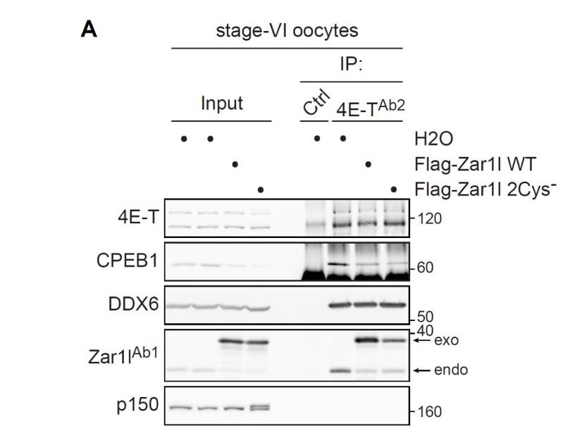 Fig. S5. CPEB1 is destabilized upon Zar1l overexpression A) Stage-VI oocytes were injected with water or mRNA encoding Flag-Zar1l.S that was either wild-type (WT) or mutated to alanine at Cys190 and Cys217 (2Cys-). After 42 h, oocyte lysates were subjected to α-4E-TAb2 or α-Ctrl IP as indicated. Samples were immunoblotted as indicated. Arrows indicate endogenous and exogenous Zar1l proteins. One representative experiment of three biological replicates is shown.
