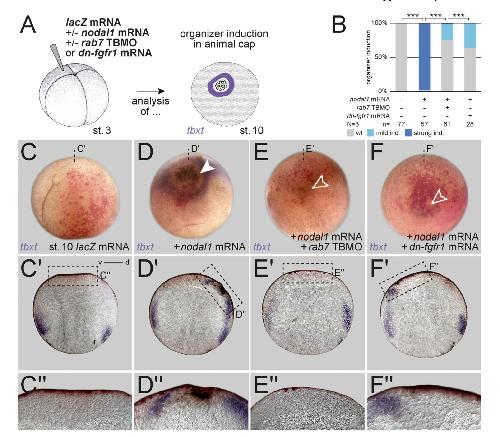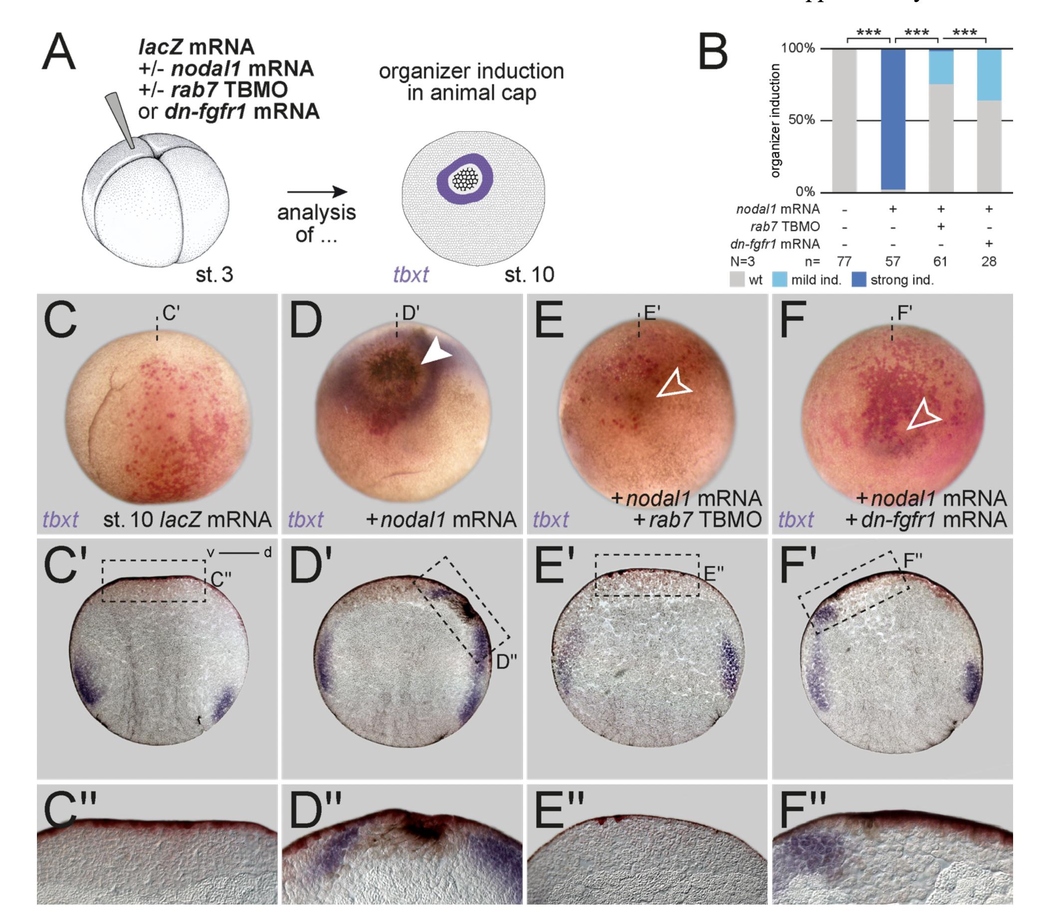 arrowhead), induction site is sphered by tbxt expression. (E, F) Co-injection of either rab7 TBMO or dn-fgfr1