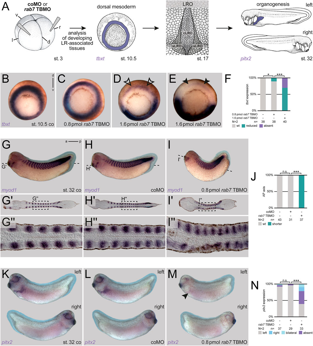 FIGURE 1. Rab7 is necessary for correct LR axis development. (A) Experimental setup for the shown experiments: Injections at four-cell stage (left) targeted the dorsal mesoderm to analyze mesoderm specification (tbxt; middle-left) at gastrula stages, a prerequisite for the formation of the dorsal mesoderm derived LRO (middle-right) in wild type situation during neurula stages, which in turn induces LR asymmetric features (here pitx2 expression; right) at tailbud stages. (B) Wild type circular tbxt expression of st. 10.5 control specimen, (C) injection of reduced amounts of rab7 TBMO did not alter tbxt expression, (D) whereas higher doses reduced transcripts (black outlined arrowheads) or (E) abolished them in the targeted dorsal lineage (black arrowheads). (F) Quantification of tbxt expression. (G) Uninjected st. 32 tadpole, or specimen injected with (H) coMO depicted wild type axis elongation compared to (I) shortened axis of rab7 TBMO treated specimens. (G′–I′) Please note in frontal sections through somitic lineage that all specimen showed myod1 expression in somites along AP-axis. (G′′–I′′) Magnification of myod1 expressing somites as indicated in dashed boxes, respectively. Please note altered somite shapes in morphants. (J) Quantification of axis phenotype. (K) Left-sided pitx2 expression in untreated st. 32 tadpoles and (L) coMO injected ones. (M) Lost left-sided pitx2 expression upon rab7 knockdown (black arrowhead). (N) Quantification of pitx2 expression. a, anterior; cLRO, central LRO; co, control; coMO, control Morpholino oligomere; d, dorsal; l, left; LRO, left-right organizer; N, number of experiments; n, number of evaluated embryos; n.s., not significant; p, posterior; pmol, picomole; r, right; sLRO, somitic LRO; st., stage; TBMO, translation blocking Morpholino oligomere; v, ventral; wt, wild type.