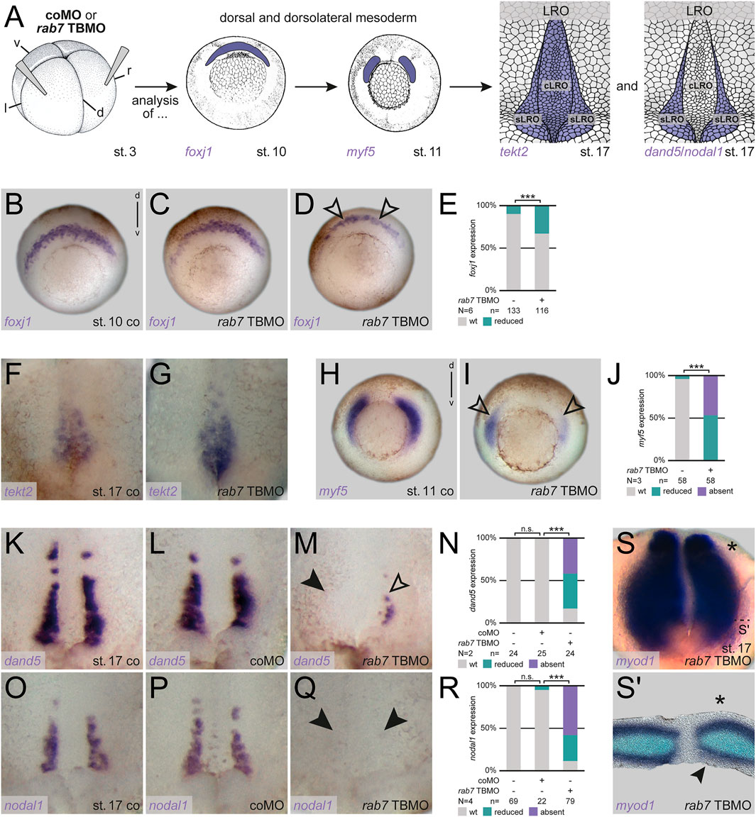 FIGURE 2. Rab7 knockdown resulted in loss LRO sensor tissue. (A) Experimental setup for the shown experiments: Injections at four-cell stage (left) targeted the dorsal/dorsolateral mesoderm to analyze superficial mesoderm induction (foxj1; middle) or somitic mesoderm specification (myf5; middle) at gastrula stages, following analyses of general LRO formation (tekt2; right) or sLRO specification (dand5/nodal1; right) during neurulation. (B) Wild type crescentic foxj1 transcripts were (C) unaltered or (D) mildly affected by low dose rab7 TBMO injections (black outlined arrowheads). (E) Quantification of foxj1 expression. (F) Expression domain of tekt2 in the LRO of st. 17 embryos, (G) depicted slightly stronger posterior and reduced anterior signals upon low dose rab7 TBMO treatment. (H) Wild type dorsolateral myf5 expression (I) was significantly reduced in rab7-morphant embryos (black outlined arrowheads). (J) Quantification of myf5 expression. (K,O) Expression of dand5 and nodal1 in the somitic domains of the LRO of control and (L,P) coMO injected specimen, respectively. (M) Transcripts of dand5 or (Q) nodal1 were lost (black arrowheads) or severely reduced (black outlined arrowheads) in rab7-deficient embryos (low dose TBMO). (N,R) Quantification of dand5 and nodal1 expression, respectively. (S) Left-sided unilateral knockdown (marked by asterisk) of low dose rab7 TBMO in myod1 expressing LRO, (S′) section revealed lost superficial expression of myod1 at injection side (black arrowhead). cLRO, central LRO; co, control; coMO, control Morpholino oligomere; d, dorsal; l, left; LRO, left-right organizer; N, number of experiments; n, number of evaluated embryos; n.s., not significant; r, right; sLRO, somitic LRO; st., stage; TBMO, translation blocking Morpholino oligomere; v, ventral; wt, wild type.