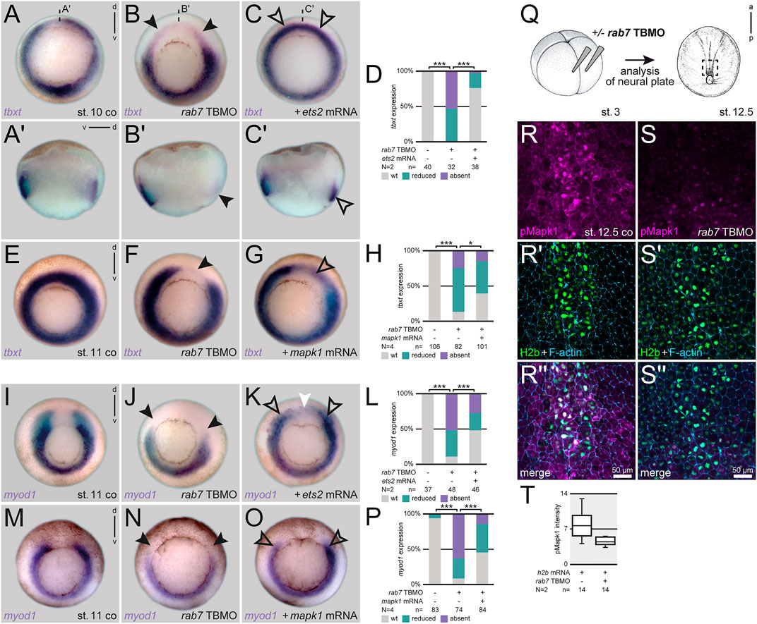 FIGURE 3. Loss of Rab7 blocks dorsal mesoderm specification upstream of Mapk activation. (A) Uniform circular appearance of tbxt expression of st. 10 Xenopus embryos (B) faded due to dorsal knockdown of rab7 (black arrowheads). (C) Rescue injection of ets2 mRNA restored expression almost back to wild type level (outlined black arrowheads). (A′–C′) Panels beneath depict corresponding sagittal sections. (D) Quantification of tbxt expression rescued by ets2 mRNA. (E) Circular tbxt expression of st. 11 specimen (F) faded upon unilateral dorsal rab7 LOF (black arrowhead). (G) Coinjection of mapk1D324N mRNA in morphant embryos partially restored lost dorsal tbxt expression (black outlined arrowhead). (H) Quantification of tbxt expression rescued by mapk1D324N mRNA. (I) myod1 horseshoe-shaped expression of st. 11 specimen (J) displayed downregulated paraxial transcripts after dorsal loss of rab7 (black arrowheads). (K) ets2 mRNA injected dorsally rescued the paraxial mesoderm identity (outlined black arrowheads); please note ectopic expression found in animal areas above the dorsal gap (white arrowhead). (L) Quantification of myod1 expression rescued by ets2 mRNA. (M) Horseshoe myod1 expression of st. 11 specimen (N) faded upon dorsal rab7 LOF (black arrowheads). (O) Coinjection of mapk1D324N mRNA in morphant embryos partially restored lost dorsal myod1 expression (black outlined arrowheads). (P) Quantification of myod1 expression rescued by mapk1D324N mRNA. (Q) Injection scheme and localization of imaged animal tissue of st. 12.5 embryos (R,R′′) Nucleic and cytosolic accumulation of pMapk1 (magenta) at posterior neural plate of wild type specimen. (S,S′′) Downregulation of pMapk1 signal intensity in rab7-morphant neural plates. (R′,S′) For lineage tracing and nuclear staining of h2b mRNA (green) was used, cell borders are highlighted by F-actin (blue). (T) Intensity quantification of pMapk1 signal in panels (R,S). All rab7 TBMO injections in this figure were done with high dose approach. a, anterior; co, control; d, dorsal; N, number of experiments; n, number of evaluated embryos; p, posterior; pmol, picomole; st., stage; TBMO, translation blocking Morpholino oligomere; v, ventral; wt, wild type; µm, micrometer.
