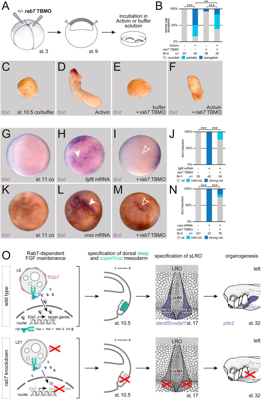 FIGURE 4. Rab7 is required for FGF-dependent mesoderm induction. (A) Experimental setup for the shown animal cap elongation assay: Injection at four-cell stage (left) targeted the animal hemisphere, at st. 9 animal caps were dissected (middle) and incubated in Activin A or buffer solution (right). (B) Quantification of animal cap elongation. (C) Untreated animal caps (D) elongated upon Activin treatment. (E) rab7-deficient, untreated animal caps remained in a roundish shape, (F) treated ones depicted partial or complete inhibition of elongation. (D) tbxt expression was only observed in Activin treated, elongated caps. (G,K) Wild type animal caps of st. 11 embryos. (H) Induction of tbxt expression (white arrowheads) in animal caps by fgf8 or (L) vras mRNA overexpression. (I,M) Loss of rab7 in those animal caps blocked tbxt induction (outlined arrowheads). (J,N) Quantification of tbxt induction via fgf8 or vras mRNA. All rab7 TBMO injections in this figure were done with high dose approach. (O) Proposed model for Rab7-dependent dorsal mesoderm and subsequent sLRO specification triggering LR development: (Top) Rab7-positive LEs could provide the platform for sustained FGF signal transduction (left). FGF signals mediate deep and superficial mesoderm specification (middle-left). Mesoderm development enables LRO morphogenesis (middle-right), the crucial tissue for LR asymmetry (right). (Bottom) Loss of Rab7 would inhibit FGF signal maintenance due to lost signaling platforms (left), causing a lack of deep and superficial mesoderm specification (middle-left). Loss of mesoderm prevents sLRO formation (middle-right) blocking LR axis establishment (right). cLRO, central LRO; co, control; d, dorsal; ind., induction; LRO, left-right organizer; N, number of experiments; n, number of evaluated embryos; sLRO, somitic LRO; st., stage; TBMO, translation blocking Morpholino oligomere; v, ventral; wt, wild type.
