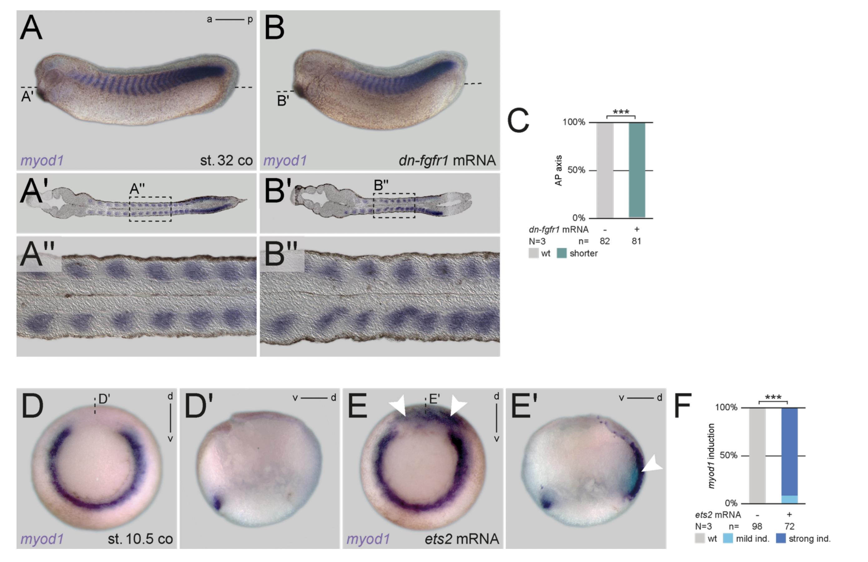 ectopic myod1 induction upon ets2 mRNA overexpression (white arrowheads), (D', E') clarified in sagittal