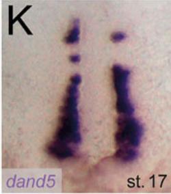 dand5 (DAN domain family member 5, BMP antagonist) gene expression in X. laevis embryo, NF stage 17, in the somitic domains of the LRO (Left Right Organizer) of the gastrocoel roof plate.