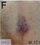 tekt2 (tektin 2) gene expression in X. laevis embryo, NF stage 17, assayed via in situ hybridization, in etc central domains of the LRO ( left right organizer) of the gastrocoel roof plate.