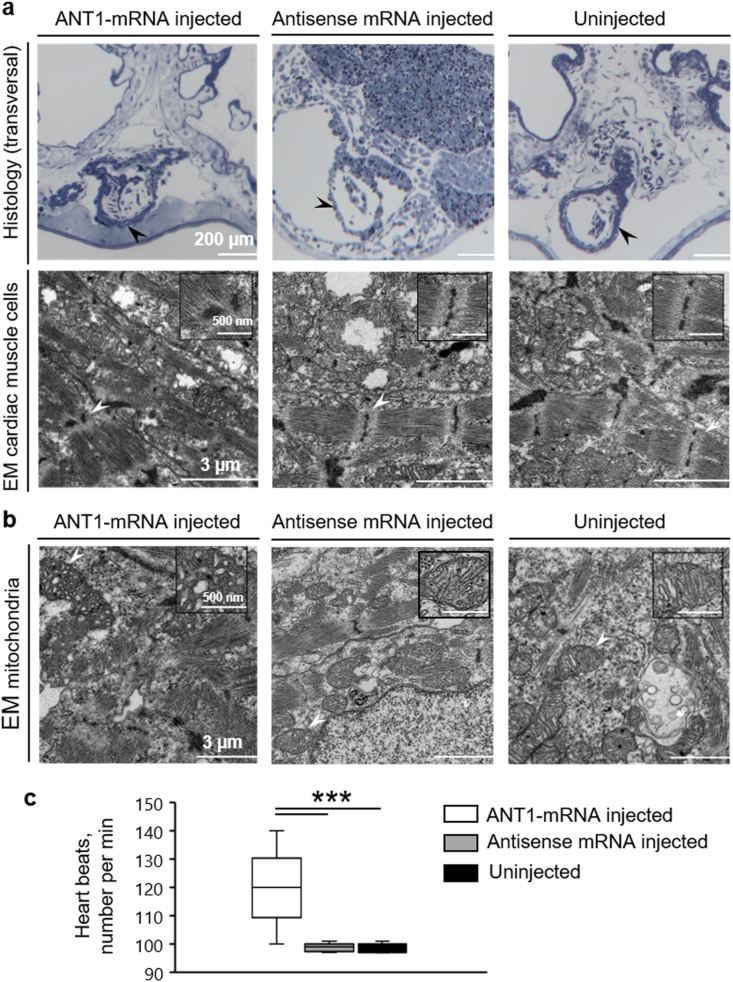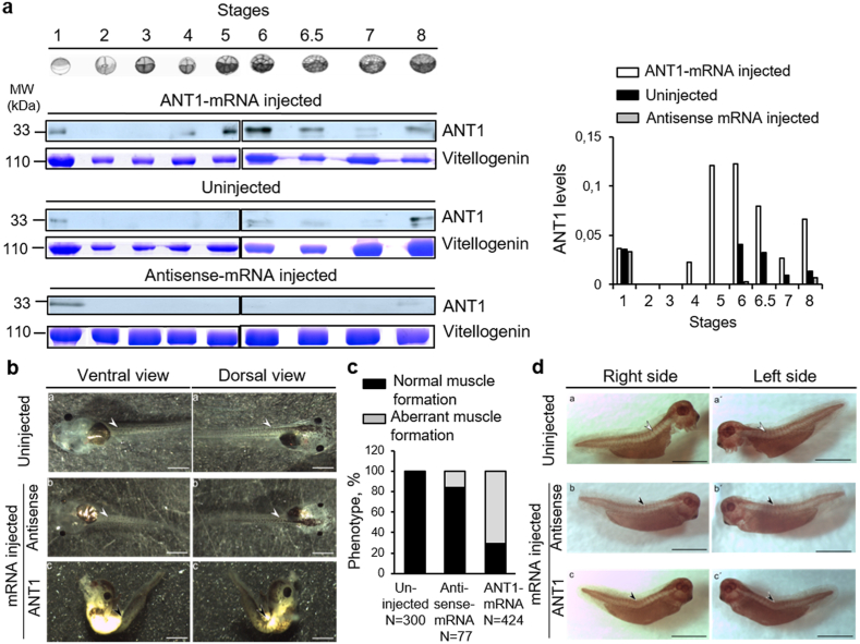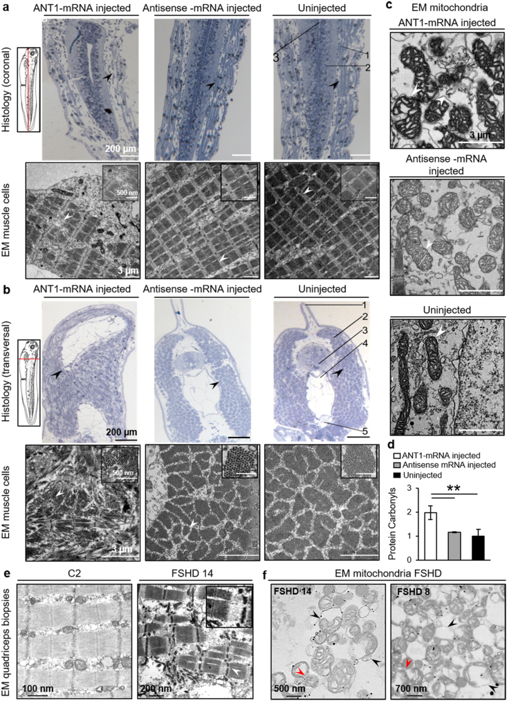 Facioscapulohumeral muscular dystrophy (FSHD) is an autosomal dominant disorder characterized by progressive muscle weakness. Adenine nucleotide translocator 1 (ANT1), the only 4q35 gene involved in mitochondrial function, is strongly expressed in FSHD skeletal muscle biopsies. However, its role in FSHD is unclear. In this study, we evaluated ANT1 overexpression effects in primary myoblasts from healthy controls and during Xenopus laevis organogenesis. We also compared ANT1 overexpression effects with the phenotype of FSHD muscle cells and biopsies. Here, we report that the ANT1 overexpression-induced phenotype presents some similarities with FSHD muscle cells and biopsies. ANT1-overexpressing muscle cells showed disorganized morphology, altered cytoskeletal arrangement, enhanced mitochondrial respiration/glycolysis, ROS production, oxidative stress, mitochondrial fragmentation and ultrastructure alteration, as observed in FSHD muscle cells. ANT1 overexpression in Xenopus laevis embryos affected skeletal muscle development, impaired skeletal muscle, altered mitochondrial ultrastructure and led to oxidative stress as observed in FSHD muscle biopsies. Moreover, ANT1 overexpression in X. laevis embryos affected heart structure and mitochondrial ultrastructure leading to cardiac arrhythmia, as described in some patients with FSHD. Overall our data suggest that ANT1 could contribute to mitochondria dysfunction and oxidative stress in FSHD muscle cells by modifying their bioenergetic profile associated with ROS production. Such interplay between energy metabolism and ROS production in FSHD will be of significant interest for future prospects.