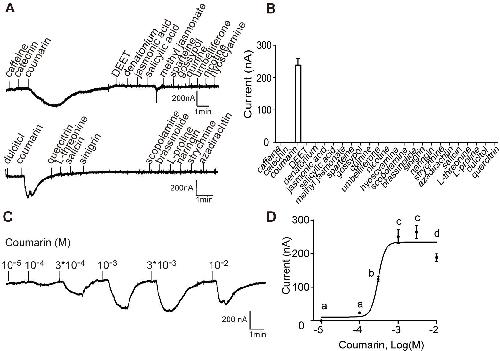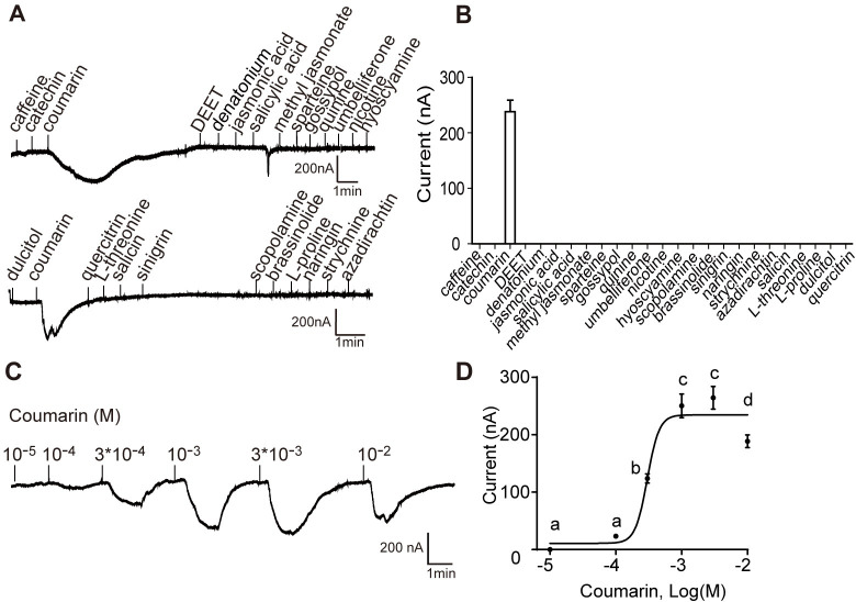 Fig 2. Functional analysis of Helicoverpa armigera Gr180 in Xenopus oocytes.(A) Representative inward current responses of Xenopus oocytes expressing Gr180 in response to compounds. (B) Response profiles of Xenopus oocytes expressing Gr180 in response to compounds (n = 8–14). (C) Representative inward current responses of Xenopus oocytes expressing Gr180 in response to coumarin at a range of concentrations. (D) Dose responses of Xenopus oocytes expressing Gr180 to coumarin (n = 8). Data are mean ± SEM. Different letters are significantly different at p < 0.05 (one-way ANOVA followed by post-hoc analysis with Tukey’s HSD test).
