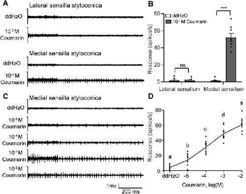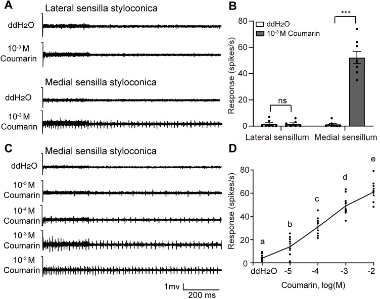 Fig 3. Electrophysiological response of sensilla styloconica on the maxillary galea of Helicoverpa armigera larvae to coumarin.(A) Representative responses and (B) spike frequencies of lateral and medial sensilla styloconica to coumarin and double distilled water (ddH2O) at 10−3 M (n = 8). *** and ns indicate significant difference (p < 0.001) and no significant difference (p > 0.05), respectively (two-tailed independent samples t-test). (C) Representative responses of medial sensilla styloconica to coumarin at a series of concentrations. (D) Dose responses of medial sensilla styloconica to coumarin (n = 8–10). Different letters indicate significant difference (one-way ANOVA followed by post-hoc analysis with Tukey’s HSD test). Data are mean ± SEM.