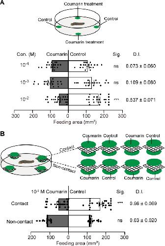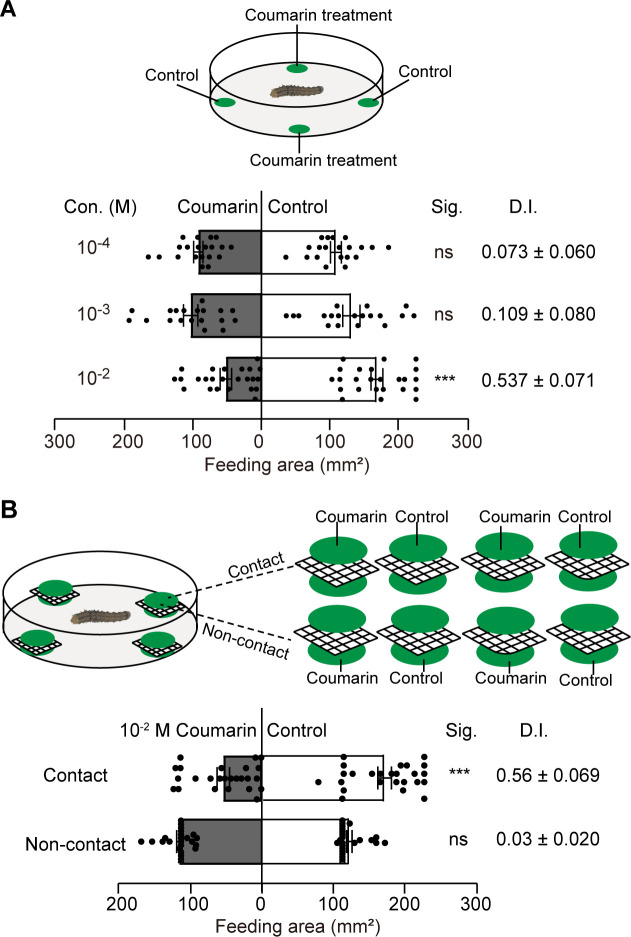 Fig 4. Feeding deterrence of the fifth instar Helicoverpa armigera larvae to coumarin by contact chemoreception.(A) Two-choice feeding assays with cowpea leaf discs: the feeding area of coumarin-treated discs (grey bars) and control discs (white bars) were measured (n = 19–20). (B) Modified two-choice feeding assays with ‘sandwich’ leaf discs: in the contact two-choice feeding assay, coumarin or control discs were painted on the upper leaf discs (n = 25); in the non-contact feeding assay, coumarin or control discs were painted on the lower leaf discs that prevented larvae from feeding (n = 24); the feeding area of the consumed upper leaf discs was measured. Feeding deterrence index (D.I.) = (consumed areas of the control discs—consumed areas of the treated discs) / (consumed areas of the control discs + consumed areas of the treated discs). Data are mean ± SEM. *** and ns indicate significant difference (p < 0.001) and no significant difference (p > 0.05), respectively (two-tailed paired samples t-test).