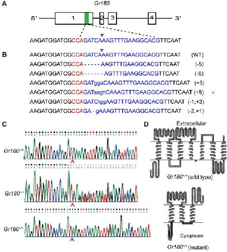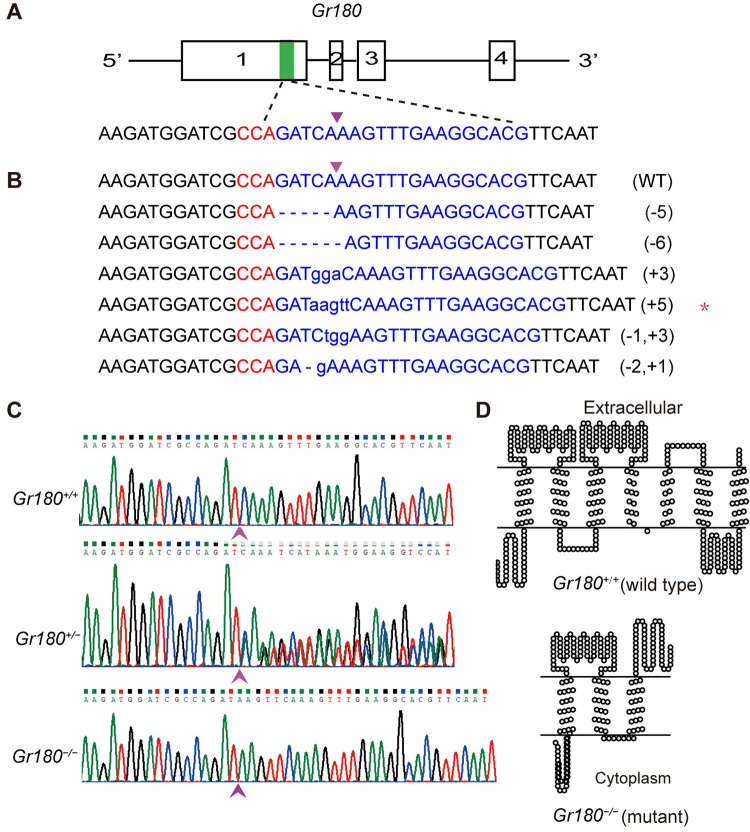 Fig 5. Establishment of Gr180 homozygous mutants of Helicoverpa armigera via CRISPR-Cas9.(A) Genomic structure of Gr180 and designation of sgRNA. Exons are shown as boxes and the lines between two exons indicate the introns. The sgRNA are located on the antisense strand of exon-1 (green box). The sgRNA targeting sequence is shown in blue and the PAM sequence is shown in red. (B) Various mutant genotypes of Gr180 identified by sequencing of the G1 adult PCR products. Purple inverted triangle indicates the cleavage site of Cas9 nuclease. Dashes indicate the deleted bases; lowercase letters are the inserted bases. The numbers of inserted or deleted bases are displayed at the right of each allele (+ insertion;–deletion). Red asterisks indicate the selected genotype to establish the homozygous mutant strain. (C) Representative chromatograms of direct sequencing of the PCR products obtained from wild types (Gr180+/+, upper graph), heterozygous mutants (Gr180+/−, middle graph), and homozygous mutants (Gr180−/−, lower graph). The start site of overlapping peaks is marked by a purple arrow. (D) Secondary structure prediction of wild type and truncated Gr180 protein. TOPCONS (topcons.net) models were used to predict secondary structure, and TOPO2 software (http://www.sacs.ucsf.edu/TOPO2/) was used to construct the images. In WT, the Gr180 protein consists of seven transmembrane domains, the truncated protein consists of three transmembrane domains in the mutants.