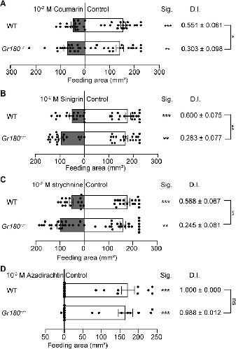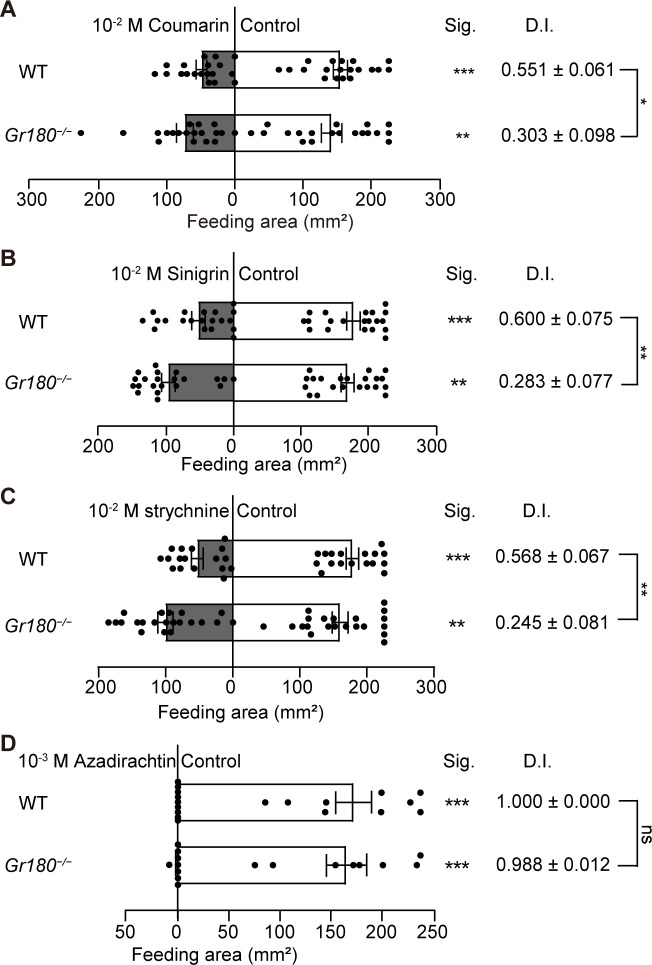 Fig 7. Feeding responses of Helicoverpa armigera wild type (WT) and Gr180−/− mutant larvae to four deterrent compounds.(A) Control vs 10−2 M coumarin (WT: n = 19; Gr180−/−: n = 19). (B) Control vs 10−2 M sinigrin (WT: n = 20; Gr180−/−: n = 21). (C) Control vs 10−2 M strychnine (WT: n = 17; Gr180−/−: n = 21). (D) Control vs 10−3 M azadirachtin (WT: n = 9; Gr180−/−: n = 8). Data are mean ± SEM. ** and *** indicate significant difference at the level of p < 0.01 and p < 0.001, respectively; ns indicates no significant difference (p > 0.05).