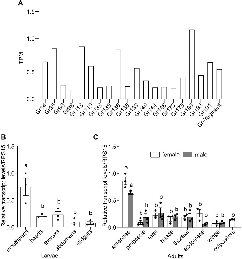 Fig 1. Expression patterns of gustatory receptors (GRs) in Helicoverpa armigera.(A) The TPM value of the top 20 highly expressed GRs in the larval maxillary galea of H. armigera via transcriptome sequencing. (B) Relative transcript levels of Gr180 in the organs of the fifth instar larvae by qRT-PCR. (C) Relative transcript levels of Gr180 in the organs of virgin female and male adults. Data are mean ± SEM, n = 3. Columns with different letters are significantly different at p < 0.05 (one-way ANOVA followed by post-hoc analysis with Tukey’s HSD test).