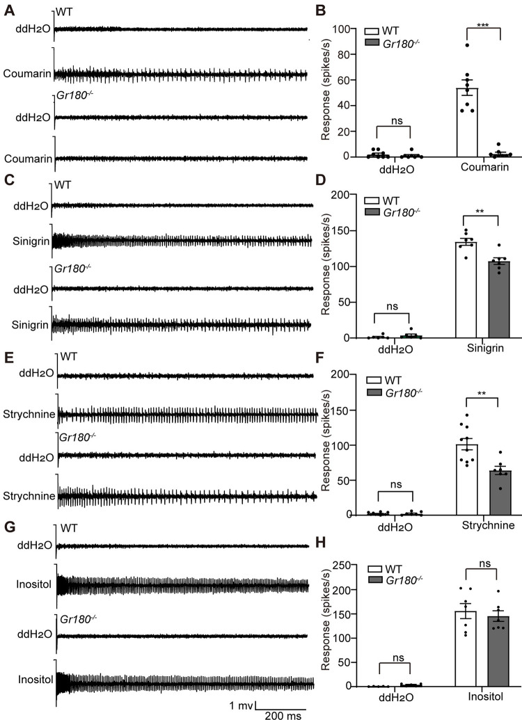 Fig 6. Electrophysiological responses of medial sensilla styloconica in larvae of Helicoverpa armigera wild type (WT) and Gr180−/− mutants.Representative responses (A, C, E, G) and spike frequencies (B, D, F, H) of medial sensilla styloconica to 10−2 M coumarin (A, B), 10−2 M sinigrin (C, D), 10−2 M strychnine (E, F), 10−3 M inositol (G, H). Data are mean ± SEM, n = 7–11. ** and *** indicate significant differences at the level of p<0.01 and p<0.001, respectively; ns indicates no significant difference (p>0.05) (two-tailed independent samples).