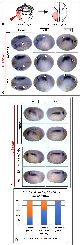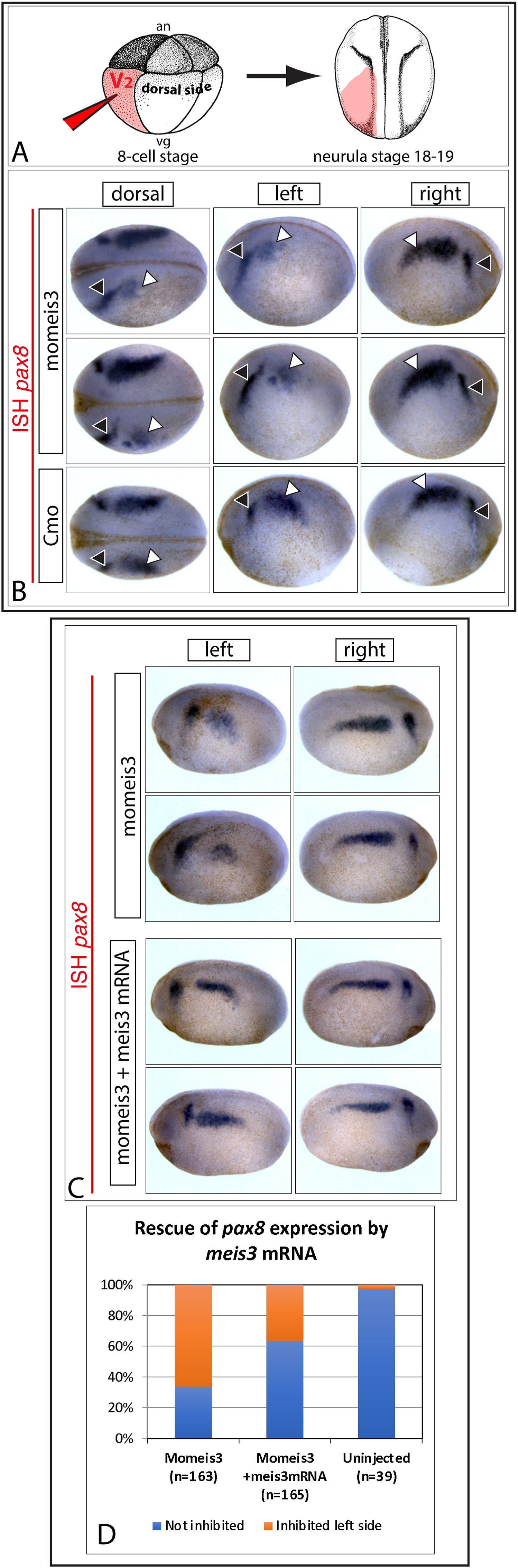 Fig. 3. Targeted meis3 depletion results in the inhibition of pax8 expression in the kidney field. A. Morpholinos are injected in the V2 blastomere at the 8-cell stage to target the kidney field on the left side of the embryo. Injected embryos are cultured until late neurula stage for ISH analysis of pax8 expression. B. Representative injected embryos. Views of dorsal region, left and right sides of the same embryos are shown. White arrowheads indicate kidney field expression and black arrowhead expression in the otic placode. Pax8 expression is strongly inhibited in the kidney field on the left side of embryos injected with Momeis3 morpholino. It is almost absent or fragmented into small patches. A control morpholino (Cmo) has no effect. C, D. Rescue experiments with a mRNA encoding a version of meis3 transcript not targeted by Momeis3. C. Representative examples of meis3-depleted and meis3 mRNA rescued embryos. D. Cumulative results from 3 independent experiments.
