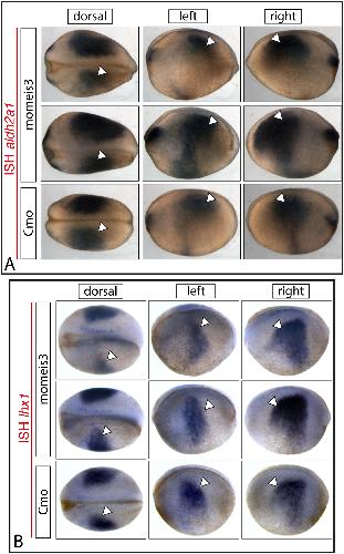 Fig. 4. Targeted meis3 depletion has a moderate effect upon aldh1a2 and lhx1 expression in the kidney field. A, B. Representative injected embryos showing aldh1a2 expression (A) or lhx1 expression (B). A. Adh2a1 expression is very dynamic and can vary from one embyo to the other. Yet comparing Momeis3 injected left side with control right side shows that expression domain in lateralmesoderm (arrowheads) is smaller on the injected side. This mild effect is not observed on embryos injected with a control morpholino (Cmo), although Cmo can slightly affect expression. B. Lhx1 expression is moderately inhibited as a result of Momeis3 injection. Lhx1 expression domain appears narrower. This is not observed after injection of Cmo, although Cmo can also slightly affect lhx1 expression.