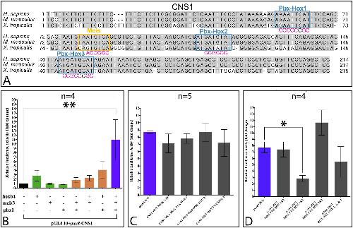 Fig. 6. Transactivation of Pax8-CNS1 by Xenopus hoxb4 combined with meis3 and pbx1. A. Alignment of pax8-CNS1 sequences from the human (hg38, chr2: 113,341,953–113,342,169), mouse (mm10, chr2: 24,539,076–24,539,292), and frog (Xenopus tropicalis; xenTro10, chr3: 125,792,358–125,792,572) with three highlighted conserved putative Pbx-Hox binding motives (blue), and one Meis (orange). Nucleotides identical in two or three sequences are shaded in grey. Mutations tested for every site are shown in red. Note that the putative binding motives mapped here show close similarity to the consensus binding sequences of Pbx-Hox (5′-ATGATTNATNN-3′) or Meis (5′-TGACAGST-3′) (Chang et al., 1996, 1997). B. Reporter expression measured for HEK293 cells transfected with pax8CNS1-luc, and various combinations of plasmids allowing expression of Xenopus hoxb4, meis3 or pbx1 indicated in the bottom of the figure. Values are expressed as fold changes relative to HEK293 cells transfected with pax8CNS1-luc alone. A significant increase of reporter expression is only observed with cells expressing a combination of hoxb4, meis3 and pbx1. Other combinations tested do not elicit any significant increase of reporter expression. ∗∗p < 0.01 (Dunn's multiple comparison test after Kruskal-Wallis test). C. Analysis of mutations of single Pbx-Hox and Meis motifs in transactivation assays. HEK293 cells were transfected with the three plasmids allowing expression of hoxb4, meis3 and pbx1 combined with wild-type pax8CNS1-luc, pax8CNS1mut-lucMeis, pax8CNS1mut-lucHP1, pax8CNS1mut-lucHP2 or pax8CNS1mut-lucHP3. Values are expressed as fold changes relative to HEK293 cells transfected with wild-type pax8CNS1-luc. None of the single mutation tested significantly affected transactivation. D. Analysis of multiple mutations of Pbx-Hox motifs in transactivation assays. HEK293 cells were transfected with the three plasmids allowing expression of hoxb4, meis3 and pbx1 combined with wild-type pax8CNS1-luc, pax8CNS1mut-lucHP1+2, pax8CNS1mut-lucHP1+3, pax8CNS1mut-lucHP2+3 or pax8CNS1mut-lucHP1+2 + 3. Values are expressed as fold changes relative to HEK293 cells transfected with wild-type pax8CNS1-luc. Combining mutation of Pbx-Hox 1 and 3 motifs results in a strong decrease of reporter expression, pointing to these two sites as active hox-Pbx binding sites. ∗p < 0.05 (Dunn's multiple comparison test after Kruskal-Wallis test).