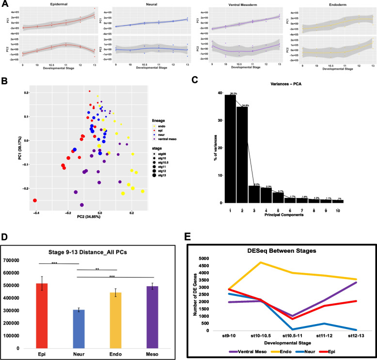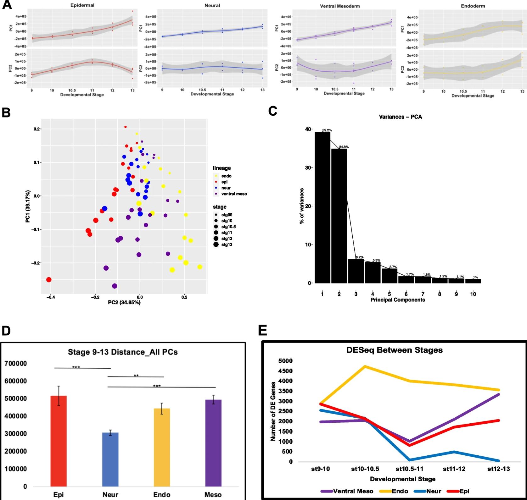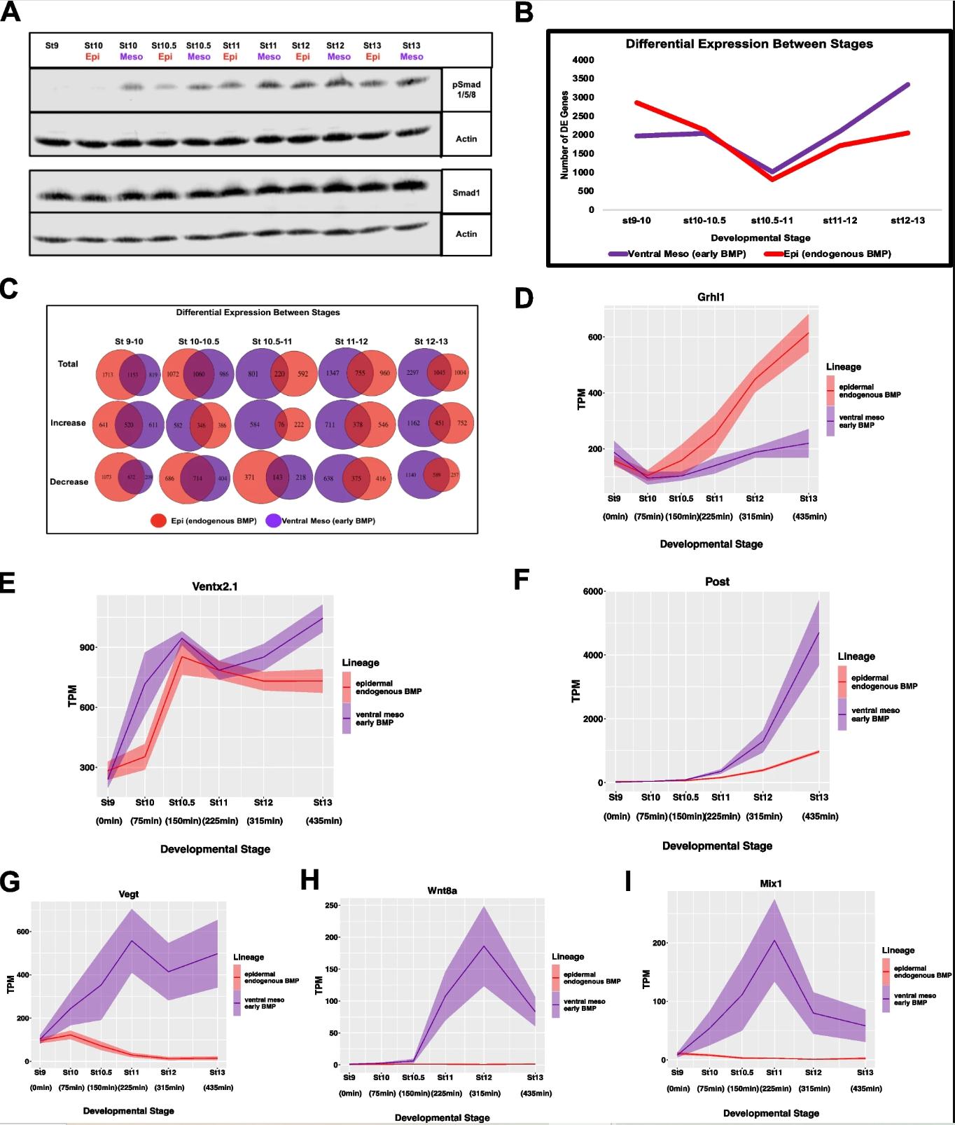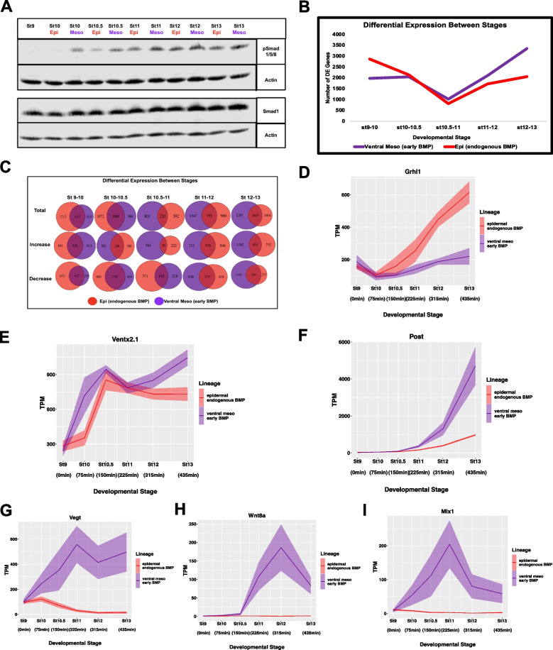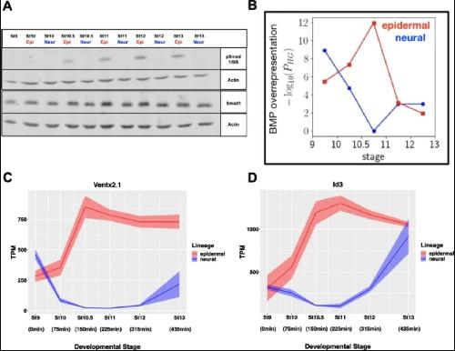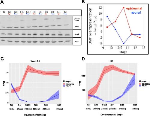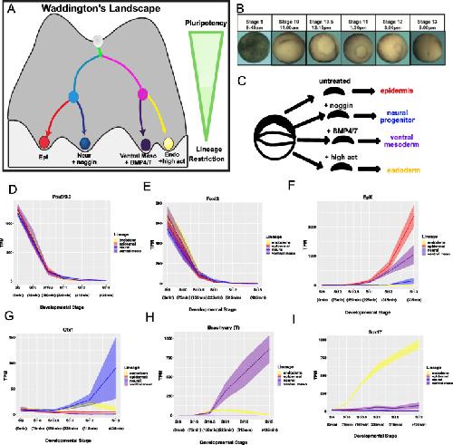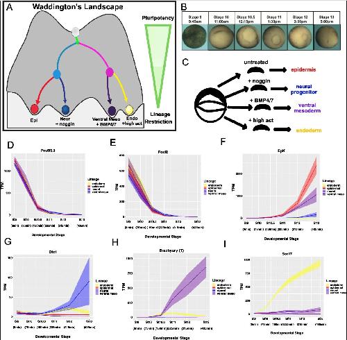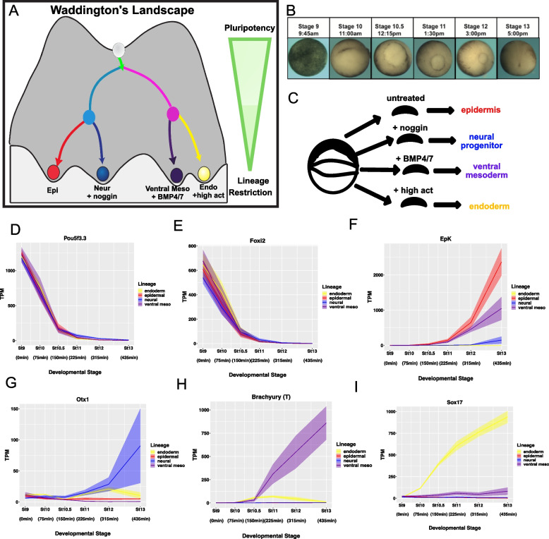 BACKGROUND: During embryogenesis, the developmental potential of initially pluripotent cells becomes progressively restricted as they transit to lineage restricted states. The pluripotent cells of Xenopus blastula-stage embryos are an ideal system in which to study cell state transitions during developmental decision-making, as gene expression dynamics can be followed at high temporal resolution. RESULTS: Here we use transcriptomics to interrogate the process by which pluripotent cells transit to four different lineage-restricted states: neural progenitors, epidermis, endoderm and ventral mesoderm, providing quantitative insights into the dynamics of Waddington's landscape. Our findings provide novel insights into why the neural progenitor state is the default lineage state for pluripotent cells and uncover novel components of lineage-specific gene regulation. These data reveal an unexpected overlap in the transcriptional responses to BMP4/7 and Activin signaling and provide mechanistic insight into how the timing of signaling inputs such as BMP are temporally controlled to ensure correct lineage decisions. CONCLUSIONS: Together these analyses provide quantitative insights into the logic and dynamics of developmental decision making in early embryos. They also provide valuable lineage-specific time series data following the acquisition of specific lineage states during development.