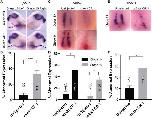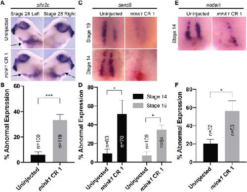 Fig. 2. Mink1 is Required for LRO Patterning. A) Representative images of pitx2c expression at stage 19. Pitx2c is normally expressed on the leftlateral plate mesoderm (arrow, top row). Pitx2c expression is impaired in mink1 crispants (typically bilateral, arrows lower row). B) Quantification of abnormal pitx2c in mink1 crispants. 6 biological replicates included. C) Representative images of dand5 expression at stage 19 and stage 14. Anterior is to the top and posterior is to the bottom; ventral view. Dand5 expression is absent in the left-rightOrganizer of mink1 crispants after initiation of flow, stage 19 (top row), and before the initiation of flow, stage 14 (bottom row). D) Quantification of abnormal dand5 expression in mink1 crispants at stages 14 and 19.4 and 3 biological replicates included for stage 19 and 14, respectively. E) Representative images of nodal1 expression at stage 14. Anterior is to the top and posterior is to the bottom; ventral view. Nodal1 expression is also absent in the left-rightOrganizer of mink1 crispants before the initiation of flow, stage 14. F) Quantification of abnormal nodal1 expression in mink1 crispants. 4 biological replicates included. P < 0.0005 = ∗∗∗, p < 0.05 = ∗ by two-tailed T-test.