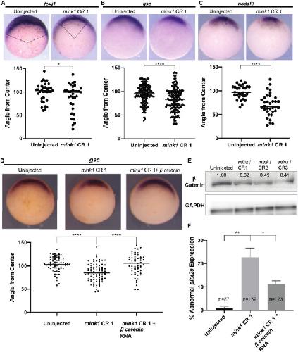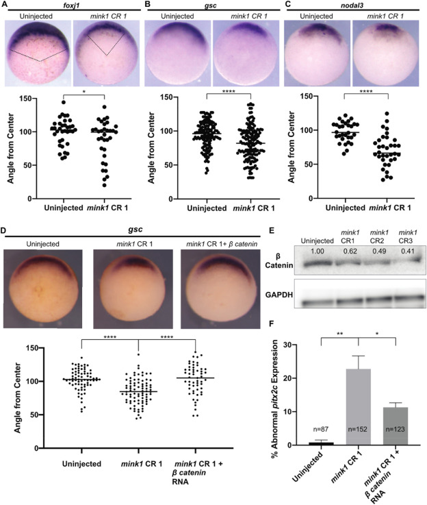 Fig. 3. Mink1 Regulates Canonical Wnt Signaling. A) Representative images of foxj1 expression in stage 10.5 uninjected embryos and mink1 crispants along with quantification. Pink lines represent angle from center measurements made in ImageJ. 3 biological replicates B) Representative images of goosecoid expression in stage 10.5 uninjected embryos and mink1 crispants along with quantification. 9 biological replicates. C) Representative images of nodal3 expression in stage 10.5 uninjected embryos and mink1 crispants along with quantification. 3 biological replicates. D) Injection of β-catenin RNA rescues loss of Spemann Organizer gene expression in mink1 crispants. Representative images of goosecoid expression along with quantification. 4 biological replicates. E) Levels of total β-catenin protein are reduced in mink1 crispants at stage 10 as assayed by Western blot. F) Injection of β-catenin RNA also rescues abnormal pitx2c expression in mink1 crispants. 3 biological replicates. P < 0.0001 = ∗∗∗∗, p < 0.005 = ∗∗, p < 0.05 = ∗ by two-tailed T-test.