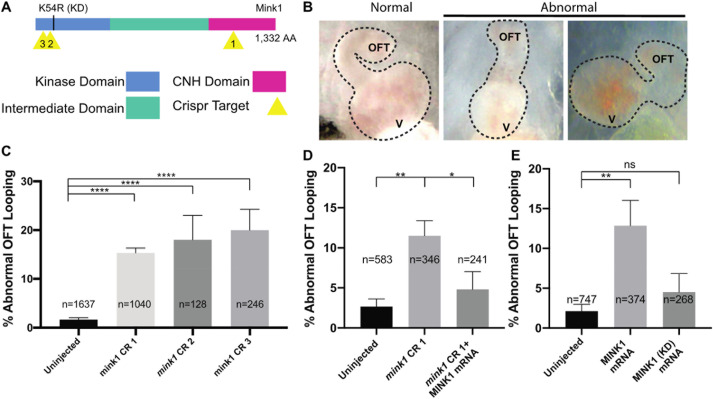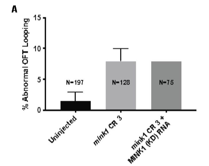 Supplementary Figure 2: MINK1 Kinase Dead Mutation Results in Loss of Function A) Quantification of abnormal OFT looping in mink1CR3 and then an additional injection of sibling mink1CR3 embryos with MINK1 kinase dead (KD) mRNA. Lower dose of MINK1 (KD) RNA used for rescue than for overexpression. 2 biological replicates.