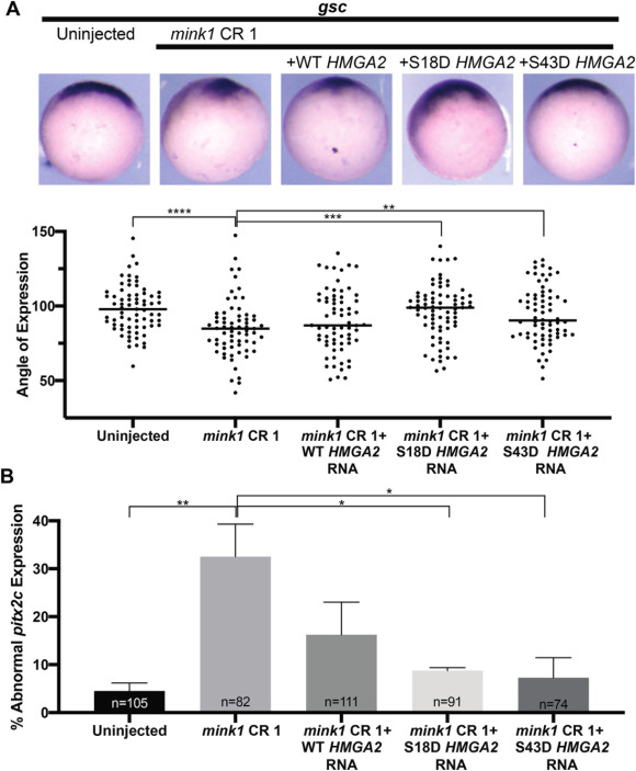 Fig. 5. Phosphomimetic HMGA2 rescues mink1 LOF phenotypes. A) Representative images goosecoid gene expression in mink1 crispants injected with WT, S18D, or S43D HMGA2 mRNA. 4 biological replicates B) Quantification of pitx2c expression in mink1 crispants injected with WT, S18D, or S43D HMGA2 mRNA. 4 biological replicates P < 0.0001 = ∗∗∗∗, p < 0.0005 = ∗∗∗, p < 0.005 = ∗∗, p < 0.05 = ∗ by two-tailed T-test.
