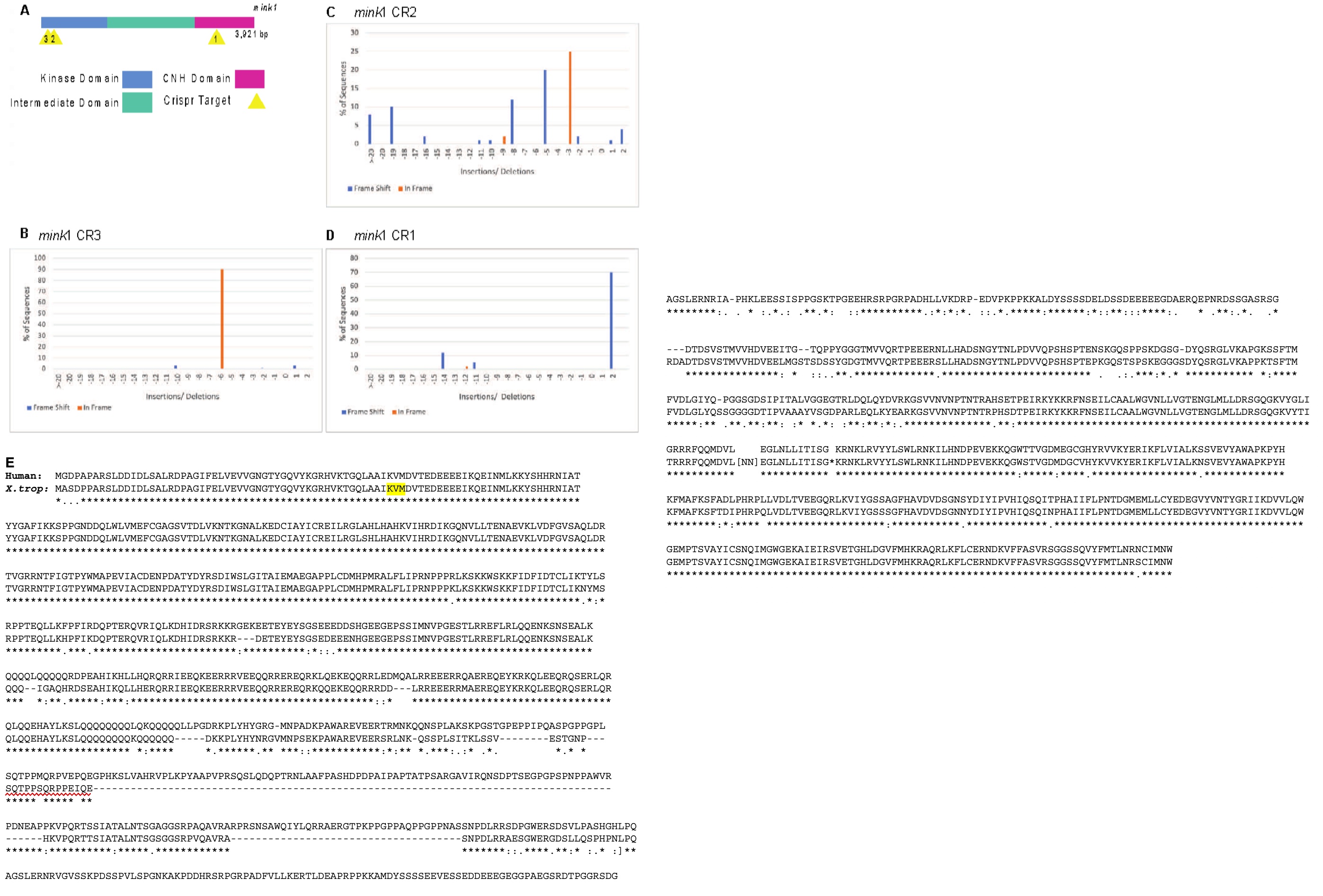 Supplementary Figure 1: mink1 CRISPR sgRNA Efficacy. A) Schematic representation of mink1 gene structure and crispr sgRNA target sites. B-D) Quantification of insertions and deletions generated by CRISPR. B) ICE results for mink1 CR 3 targeting exon 4 C) ICE results for mink1 CR 2 targeting exon 4 D) ICE results for mink1 CR 1 targeting exon 25. Histograms reflect the percentage of PCR products that have either frame shift indels (blue) or in frame indels (orange). E) Protein alignment between human MINK1 and Xenopus tropicalis Mink1. CR3 deletes 6 nucleotide removing two highly conserved amino acids 55 and 56 (valine and methionine highlighted in yellow) or 54 and 55 (lysine and valine highlighted in yellow). CR 1 induces a two nucleotide insertion (red) which results in an early stop codon (red asterisk).
