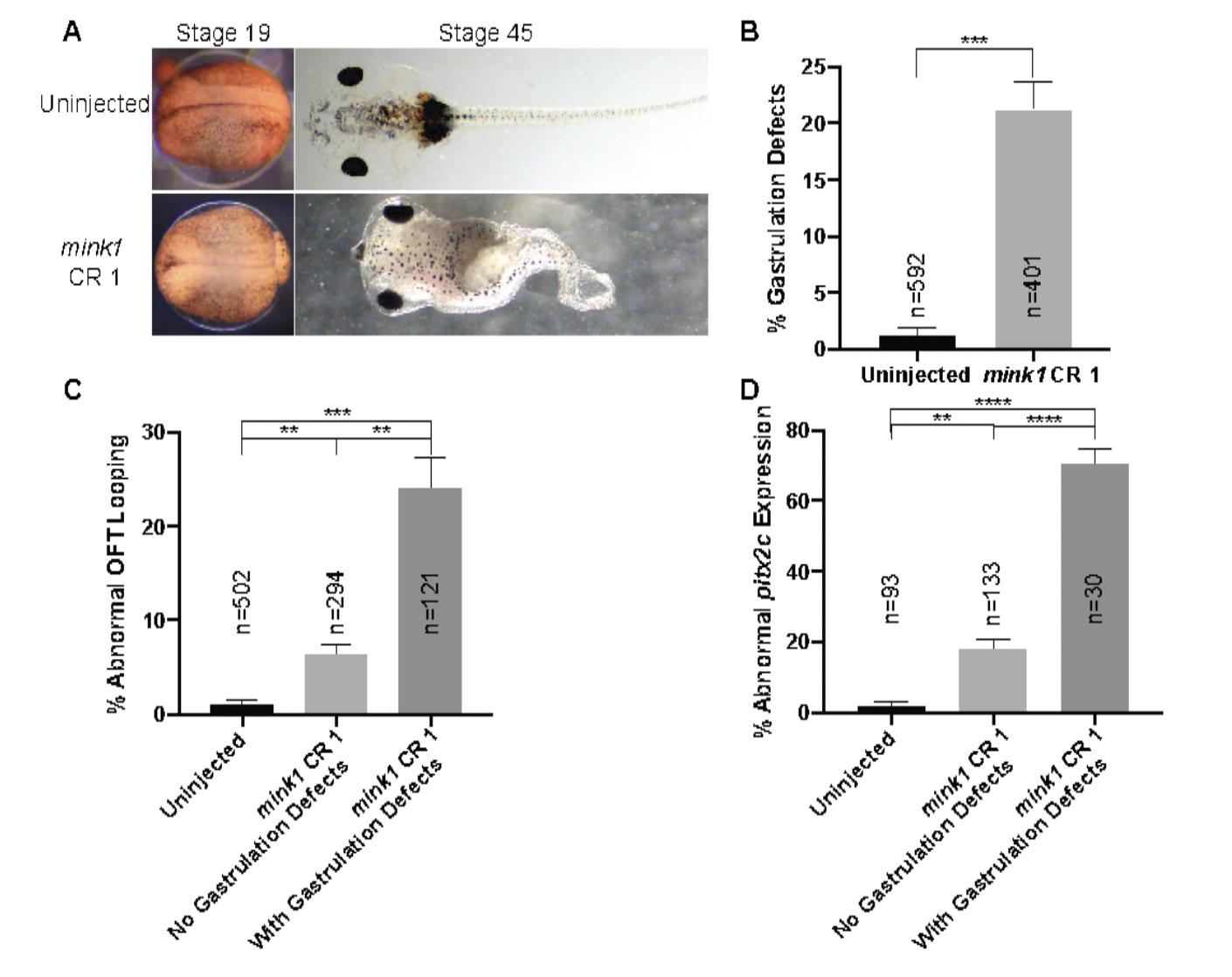 Supplementary Figure 3: Abnormal OFT looping and LR axis patterning correlate with gastrulation defects in mink1 crispants. A) Representative images of gastrulation defects seen in mink1 crispants at stage 19 and stage 45. Dorsal view, anterior to left- posterior to right. B) mink1 crispants had significant gastrulation defects. 3 biological replicates included. C) Gastrulation defects were highly correlated with abnormal cardiac outflow tract looping in mink1 crispants. 3 biological replicates. D) Gastrulation defects were highly correlated with abnormal pitx2c expression in mink1 crispants. 3 biological replicates. P < 0.0001= ****, p < 0.0005= ***, p < 0.005= ** by two-tailed T-test.