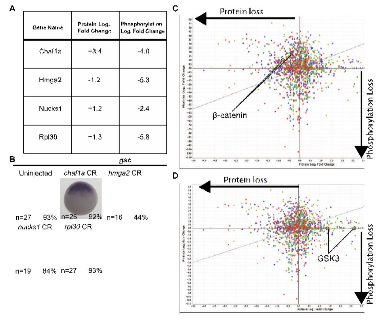 Supplementary Figure 4: Global Phosphoproteomic Analysis of mink1 Crispants Uncovered Multiple Potential Downstream Effectors. A) Chaf1a, Hmga2, Nucks1 and Rpl30 all exhibited substantial loss of phosphorylation in mink1 crispants, as well as moderate changes in protein levels. B) Hmga2 crispants exhibited the most substantial loss of Spemann Organizer gene expression. C-D: Graphic representation of global phospoproteome due to mink1 depletion, X-axis represents protein log2 fold change, Y-axis represents phosphorylation log2 fold change. Red represents stage 10, green represents stage 11, blue represents stage 12. Yellow circles represent Hmga2 protein level changes. C) β-catenin exhibited a loss of protein and gain in phosphorylation at serine-552 in mink1 Crispants. D) GSK3 exhibited a substantial gain of protein in mink1 Crispants.