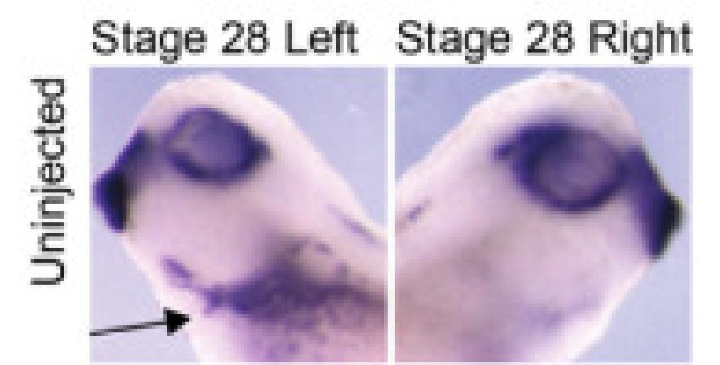 pitx2 (paired like homeodomain 2) gene expression in Xenopus laevis embryo, assayed via in situ hybridization, NF stage 28, lateral view, anteriorleft and right, dorsal up.