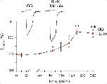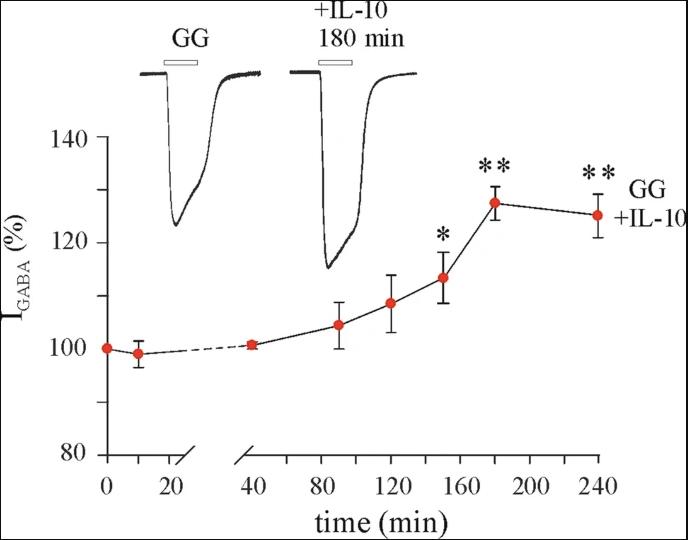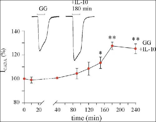 Figure 4. Time-course effect of IL-10 on GABA current amplitude in oocytes microinjected with GG tissue. GABA alone was applied at 250 μM at the beginning of each experiment (time zero) and at various time points after treatment with 100 ng/ml IL-10. Data (mean ± s.e.m.; n = 6–12 oocytes/time point; patients #8–12 in Table 1) represent the percentage increase of the peak amplitude induced by IL-10. Data were normalized to the mean current amplitude recorded at time zero (23.7 ± 8.6 nA, n = 12). Inset: Traces depict representative GABA currents at the indicated times. * = p < 0.05 by Wilcoxon signed rank test; ** = p < 0.01 by paired t-test.
