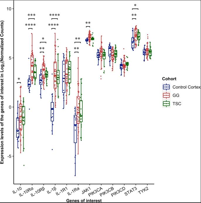 Figure 1. Expression of genes of interest in controls, GG and TSC. RNAseq data indicate significant up-regulation (adjusted p value = 0.05) of IL-10Rα, IL-10Rβ, IL-1Ra, IL-1β and STAT3 in both GG and TSC. In addition, there is a significant upregulation of IL-10 and JAK1 in GG. IL-10 downstream signaling protein such as TIK1, phosphokinases (PIK3CA, PIK3CB, PIK3CD) and IL1-R1 did not show significant changes in either GG or TSC vs controls. * p < 0.05; ** p < 0.01; *** p < 0.001; **** p < 0.0001. A linear model was fit for each gene and moderated t-statistic was calculated after applying an empirical Bayes smoothing to the standard errors. Those genes with a Benjamini–Hochberg adjusted p value < 0.05 were considered significant. Differential expression analysis compared 21 TSC patients and 15 matched control cortices; 37 GG patients and 15 matched controls cortices.