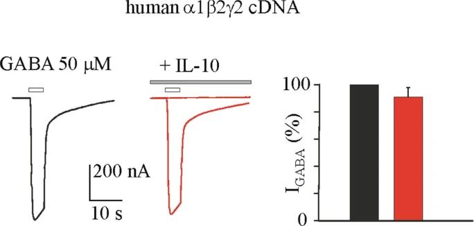 Figure 3. IL-10 effect on GABA current amplitude in oocytes injected with human α1β2γ2 cDNA. The bar-graph represents the mean and ± s.e.m. of the IGABA amplitudes evoked from oocytes intranuclearly injected with α1β2γ2 cDNAs before (black) and after (red) the incubation with IL-10 (200 ng/mL, 3 h; n = 8; p > 0.05 by paired t-test).The IGABA amplitudes recorded after the IL-10 incubation were normalized to the response obtained before exposure to IL-10 for each cell (range of current amplitudes: from 247.5 to 1119.0 nA), then averaged and expressed as a percent variation. Traces depict representative currents measured after 4 s application of GABA (white bar, 50 μM) in oocytes injected with α1β2γ2 cDNAs before (black trace) and after (red trace) IL-10 incubation (for 3 h). Grey bar on the right trace represents the block by 100 μM bicuculline (representative of 4 experiments).