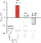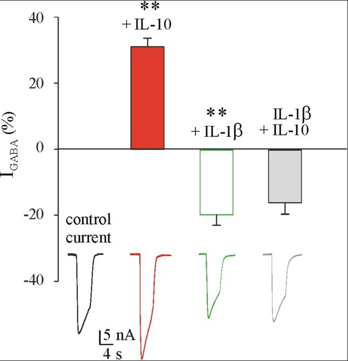 Figure 6. Effect of IL-1β on GABA current in the absence or presence of IL-10. Bar-graphs show the % variation in IGABA amplitude induced by IL-10 (red bar and trace), IL-1β (green bar and trace) or their combination (grey bar and trace) in oocytes injected with GG tissues (Patients # 8–10; Table 1). Data are expressed as a % variation of the mean current amplitude after the incubation with each cytokine singularly or in combination. Mean current variation was + 31.0 ± 2.6% after IL-10 incubation (100 ng/ml, n = 10), − 19.6 ± 3.15% after incubation with IL-1β (25 ng/ml, n = 10) and − 15.6 ± 3.5% after co-incubation with IL-10 + IL-1β (n = 10) as described in the text. ** p < 0.01 by paired t-test.